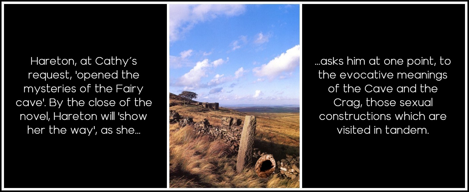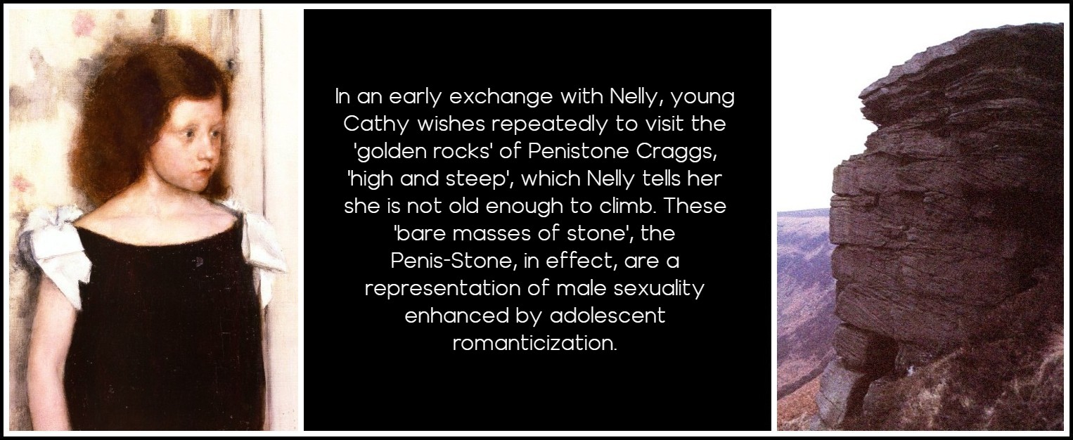 Whereas the elder Catherine began in passion and rebellion, but was attracted in the sexual crisis of adolescence to the rewards of Ladyhood, young Cathy is born the ‘little lady’, with the ‘petted will’ of one indulged and protected, yet she is increasingly attracted to the risky possibilities of experience. In an early exchange with Nelly, Cathy wishes repeatedly to visit the ‘golden rocks’ of Penistone Craggs, ‘high and steep’, which Nelly tells her she is not old enough to climb. These ‘bare masses of stone’, as Nelly calls them in the same conversation, the Penis-Stone, in effect, represent a romanticized view of male sexuality—or, to put it another way, Penistone Craggs are a representation of male sexuality enhanced by adolescent romanticization. Young Cathy is equally drawn towards an exploration of her own female sexuality, as embodied in the image of the cave near the crag, an analogue in nature of her mother’s enclosed bed: One of the maids mentioning the Fairy cave, quite turned her head with a desire to fulfil this project; she teased Mr. Linton about it; and he promised she should have the journey when she got older. Young Cathy is inevitably drawn back by her restless, as yet unnamed longings to Wuthering Heights, to which she naughtily runs away as a child, as her mother had run away at the age of twelve from nature to Thrushcross Grange. Desire has been awakened by a perceived lack, and we are, narratively speaking, on an odd backward journey towards the original Will and Desire located in the text at the site of Wuthering Heights.