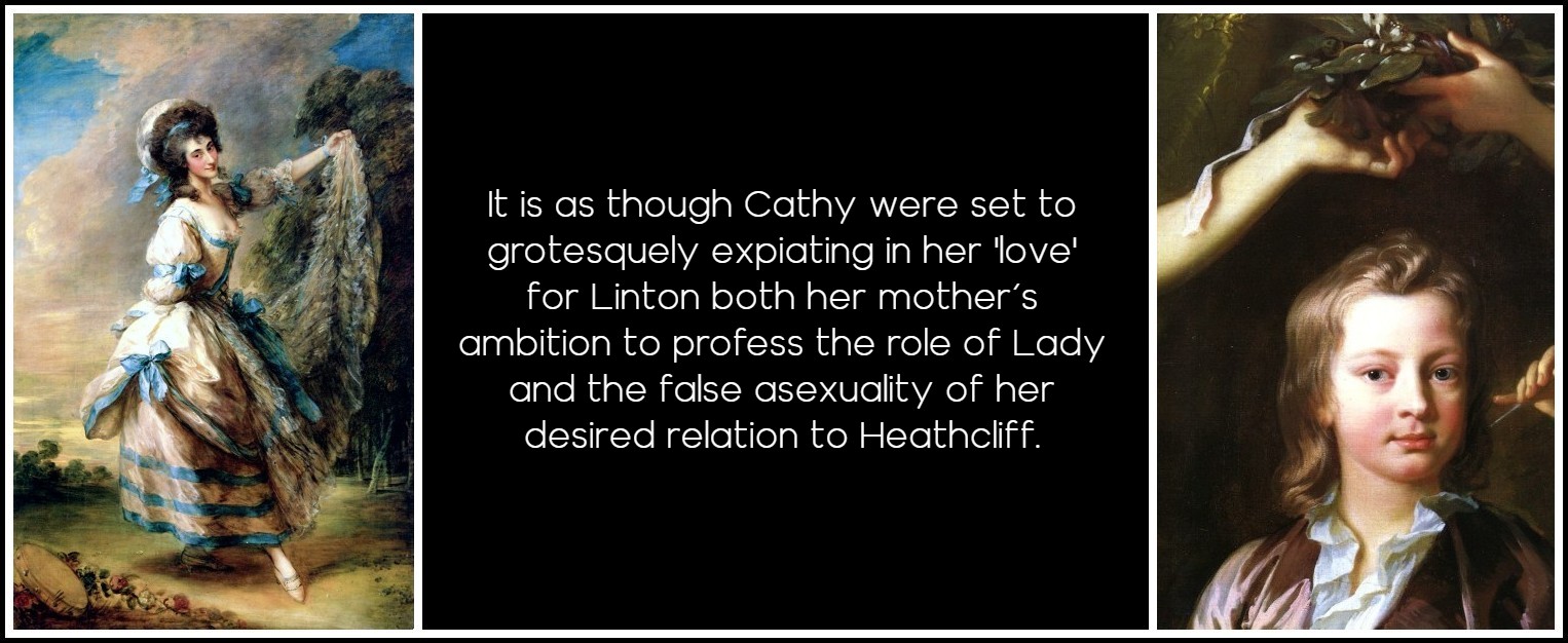 The same broad touch of caricature marks the character of Linton, the son of Heathcliff and Isabella, whom Cathy begins to visit at Wuthering Heights when she is sixteen, just as her mother was visited there by Edgar in her adolescence. Linton, ‘more of a lass than a lad’, as is intimated several times, is a parody, not only obviously of Edgar’s own effeteness, but of the stereotypical passivity and manoeuvres of the Lady. Linton ‘giggles’, ‘titters’, weeps, sulks, pouts, worries endlessly about his food and his comforts, and finally fades in a decline as delicate as that of any fragile Lady. Cathy’s relation to him is what Heathcliff and Catherine’s is often said to be: truly asexual. Though she fancies herself in love, her affection never extends much beyond ‘stroking his curls, and kissing his cheek, and offering him tea in her saucer, like a baby’, or later, ‘wishing you were my brother’. Entirely self-absorbed, Linton sees Cathy as the Lady sees a potential husband, the source of amusements, material comforts and protection, physical and economic, from the world’s abuse and hardships. In our last glimpse of him before death he is stretched on the settle, ‘sole tenant, sucking a sugar-candy, and pursuing Nelly’s movements with apathetic eyes’; he could be the childish and spoiled young lady in any number of Victorian novels, including the self-indulgent, weak and useless Georgiana, asleep on a sofa in Jane Eyre. It is as though Cathy were set to grotesquely expiating in her ‘love’ for Linton both her mother’s ambition to profess the role of Lady and the false asexuality of her desired relation to Heathcliff. Fittingly, Linton dies before the marriage with Cathy is consummated; indeed, one feels that it never could have been consummated. Like any conventional romance, it is a relation in name only, and incapable of providing a true Home.
