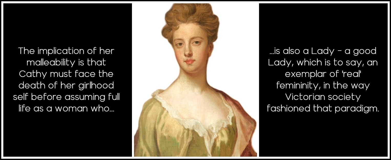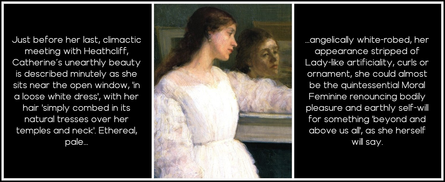 When we next see Catherine it is two months later. We now learn for the first time that Cathy is and has been pregnant; moreover, she is recovering from ‘what was denominated a brain fever’. Just before her last, climactic meeting with Heathcliff, Catherine’s unearthly beauty is described minutely as she sits near the open window, ‘in a loose white dress’, with her hair ‘simply combed in its natural tresses over her temples and neck’. Ethereal, pale, angelically white-robed, her appearance stripped of Lady-like artificiality, curls or ornament, she could almost be the quintessential Moral Feminine renouncing bodily pleasure and earthly self-will for something ‘beyond and above us all’, as she herself will say. As Nelly describes her: The flash of her eyes had been succeeded by a dreamy and melancholy softness: they no longer gave the impression of looking at the objects around her; they appeared always to gaze beyond, and far beyond—you would have said out of this world. To recall the literary convention that is being invoked, we have only to compare this with Richardson’s description of Clarissa as Belford finds her awaiting her death: We beheld the lady in a charming attitude. Dressed, as I told you before, in her virgin white, she was sitting in her elbow-chair. One faded cheek rested upon the good woman’s bosom, the kindly warmth of which had overspread it with a faint but charming flush; the other paler and hollow, as if already iced over by death. Her hands, white as the lily, with her meandering veins more transparently blue than ever I had seen even hers; her aspect was sweetly calm and serene.