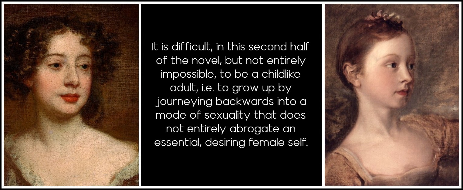 When, having offended Hareton, Cathy kisses him first, her ‘gentle kiss’ is a naively childlike expression of her sexual will, contrasting sharply with Catherine and Heathcliff’s tumultuous last reunion, when she (the first Catherine) also was said to have ‘kissed him first’. The intimate relation Cathy and Hareton achieve, that of ‘sworn allies’, seems intended as a triumphant recapturing of the ‘we-ness’ forged in rebellion by Catherine and Heathcliff, an absorption of both childhood and sexuality within the conventional vocabulary of romantic love. It is difficult, in this second half of the novel, but not entirely impossible, to be a childlike adult, i.e. to grow up by journeying backwards into a mode of sexuality that does not entirely abrogate an essential, desiring female self.