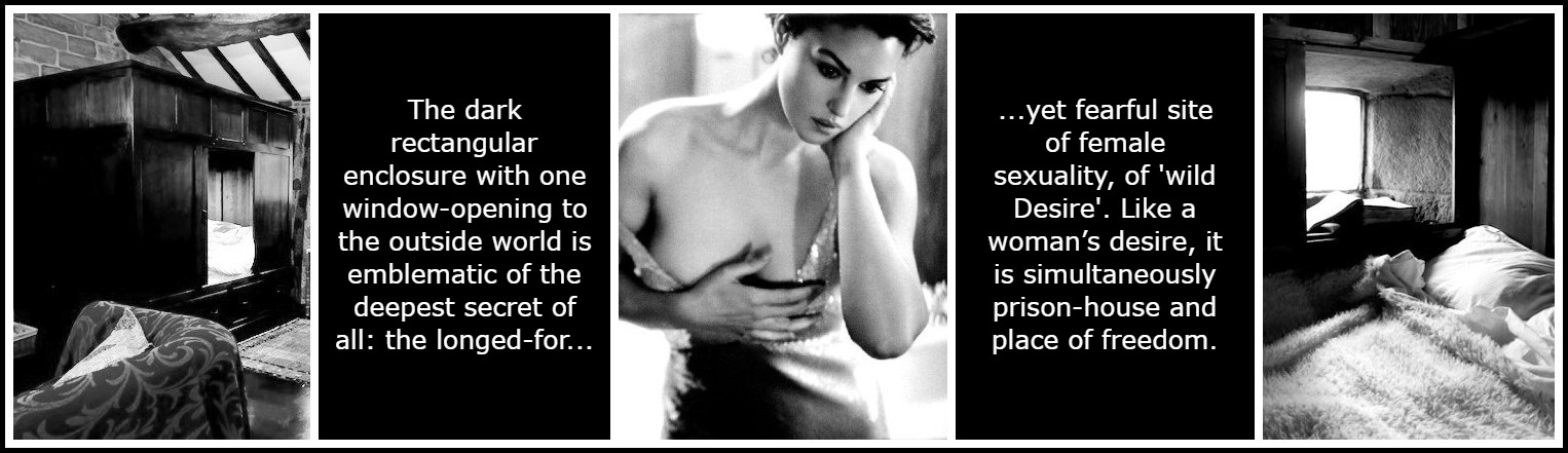 When Catherine cries in anguish, ‘Oh, if I were but in my bed in the old house!’ the recurrent image of that bed, pervading the novel from the scene of Lockwood’s dream to its close in Heathcliff’s deliberate choice of it as his death-place, unites the themes of childhood, sexuality and death in one densely wrought symbol. The old-fashioned, oak-panelled bed shares in the gathering emotional force of Wuthering Heights itself as a sacred place. As an enclosed space at the far end of a bedroom located deep in the interior of the house, it appears to be its inmost sanctuary. Carefully described as bordered by sliding panels on one side and a window on the other, it is clearly associated with the sympathetic intimacy of Catherine and Heathcliff’s childhood bond, before the adult sensibility separated the two into selves, but it is also something more. A boxlike structure, it is like a coffin with exits for a kind of movable death, the sort that will allow Catherine’s ghost to attempt to enter the bedchamber window, or her remains to dissolve with Heathcliff’s after he has ‘struck one side of the coffin loose’. And last, this dark rectangular enclosure with one window-opening to the outside world is emblematic of the deepest secret of all: the longed-for yet fearful site of female sexuality, of ‘wild Desire’. Like a woman’s desire, it is simultaneously prison-house and place of freedom.