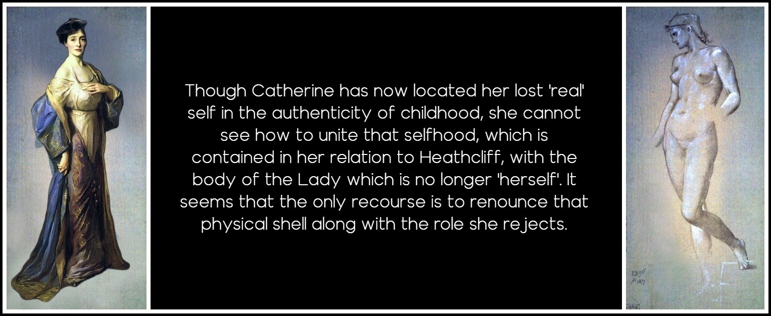 Immediately following Cathy’s recounting her memory, she wishes aloud that she were ‘a girl again, half savage and hardy, and free’, and, sure that she should ‘be myself were I once among the heather on those hills’, she urges Nelly to ‘Open the window again, fasten it open!’ Nelly refuses, saying, ‘I won’t give you your death of cold’; to which Catherine swiftly returns, ‘You won’t give me a chance of life, you mean’. Like the incursion of sexuality, the opening out of the window to the world of childhood implies both death and the chance of life at once. Though Catherine has now located her lost ‘real’ self in the authenticity of childhood, she cannot see how to unite that selfhood, which is contained in her relation to Heathcliff, with the body of the Lady which is no longer ‘herself’. It seems that the only recourse is to renounce that physical shell along with the role she rejects. Now slipping into delirium, she speaks aloud to Heathcliff, as she dares him to defy their separation by a union in death, the road home to a perpetual childhood which will evade her present problem: ‘But Heathcliff, if I dare you now, will you venture? If you do, I’ll keep you. I’ll not lie there by myself: they may bury me twelve feet deep and throw the church down over me; but I won’t rest till you are with me, I never will!’ Though Catherine now recognizes the ‘impracticability’ of their separation, the necessity of some undefined quality of selfhood which Heathcliff brings to her, she envisages a ‘spiritual’ joining, literally a union of ghostly spirits, much as at her decision to marry Edgar she had planned on a purely social relation between them. Like the spiritual adulterers of medieval courtly love, she now believes she and Heathcliff will enter a space ‘beyond’ sexuality.