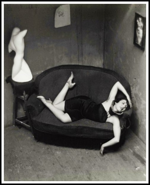 If only because of the composition of the picture, one would know it is the work of a master photographer. It is balanced, symmetrical and provocative. It is also bizarre. A woman reclines awkwardly on a couch. With her arms and legs creating a shape resembling a swastika, she cannot be comfortable. So why has she assumed this position? Why is she dressed as she is, in a dark strapless dress or slip to which is attached a neckpiece resembling a harness? And what to make of the images which surround her: a sculpture of a naked man, a painting or photograph of a sculpture of a naked woman, and an indecipherable picture between them on a wall? The sexual implications of all of this indicate either that she is masturbating with her thighs or reclining languorously in a brothel, or both. Her facial expressions indicate that she might be experiencing an orgasm. The raised upper right arm of the male sculpture (it has no lower arm) points toward the female sculpture in a manner suggesting an erection. This photograph is sexually charged. The scene appears to be a house of love, and someone (the photographer) is spying on the woman. It therefore emphasizes the sexual possibilities of the title of Nin’s novel. But the woman might just as easily represent Sabina using sex (with her lovers) to find love and completion as a human being, goals she fails to attain. That is, Kertész’s picture is not out of keeping with the novel’s title or its main character’s psychological state.