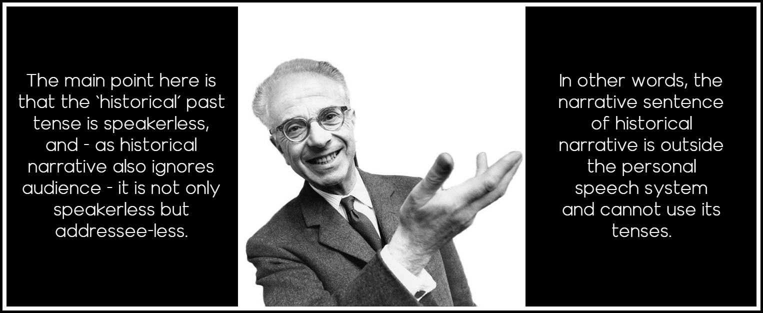 The main point here, however, is that the ‘historical’ past tense is speakerless, and—as historical narrative also ignores audience—it is not only speakerless but addressee-less. In other words, the narrative sentence of historical narrative is outside the personal speech system and cannot use its tenses. Nor can it use its deictics: it has to say ‘then’ for ‘now,’ ‘there’ for ‘here,’ ‘the next day’ for ‘tomorrow,’ ‘the day before’ for ‘yesterday,’ ‘the following year’ for ‘next year,’ and so on; it should even avoid deictic verbs, which situate the speaker in space (e.g., ‘came’ versus ‘went’). The tenses of speech mode are the present, the present perfect, and the future. The French imperfect, which in English is the past progressive (was going) or iterative (would [often] go), seems to belong to both historical narrative and the personal speech system. Hence Proust could use the imperfect for the dead aorist throughout his long narrative without causing much shock or even notice. In English, as the past tense is also part of the speech system, there is no dead aorist, as already noted.