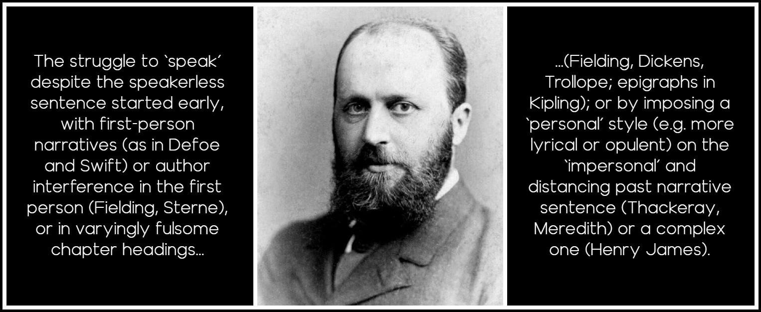 It may seem contradictory to talk of a revolt against author intrusions and at the same time to cite a structuralist’s dictum that in the narrative sentence ‘no one speaks.’ It isn’t really. Benveniste is talking about the historian’s sentence, and one of the sources of the modern novel is the chronicle. But the struggle to ‘speak’ despite the speakerless sentence started early, with first-person narratives (as in Defoe and Swift) or author interference in the first person (Fielding, Sterne), or in varyingly fulsome chapter headings (Fielding, Dickens, Trollope; epigraphs in Kipling); or by imposing a ‘personal’ style (for example, more lyrical or opulent) on the ‘impersonal’ and distancing past narrative sentence (Thackeray, Meredith) or a complex one (Henry James).