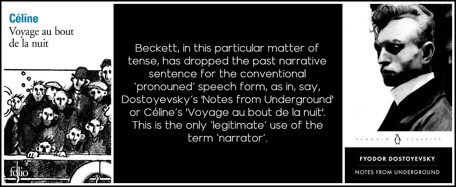 Beckett, in this particular matter of tense, has dropped the past narrative sentence for the conventional ‘pronouned’ speech form, as in, say, Dostoyevsky’s Notes from Underground or Céline’s Voyage au bout de la nuit. This is the only ‘legitimate’ use of the term ‘narrator’. Duras is still using the traditional past tense narrative sentence to introduce the man and girl, but once the child is gone, taking with him the quotation marks and the parentheticals, the rest is in dialogue (designated with mere dashes), therefore in conventional speech forms. Duras, in other words, still uses the convention of past tense for narrative. But she will soon adopt the present tense, if not always dropping the parentheticals but emphasizing them, for example, in La Maladie de la mort (1982): Et puis elle demande: Vous voulez quoi? Vous dites que vous voulez essayer [indirect speech for several lines]. Elle demande: Essayer quoi? Vous dites: D’aimer. And in most of her later novels the present tense is used vividly, dramatically, to increase the emotion, and sometimes omnisciently.