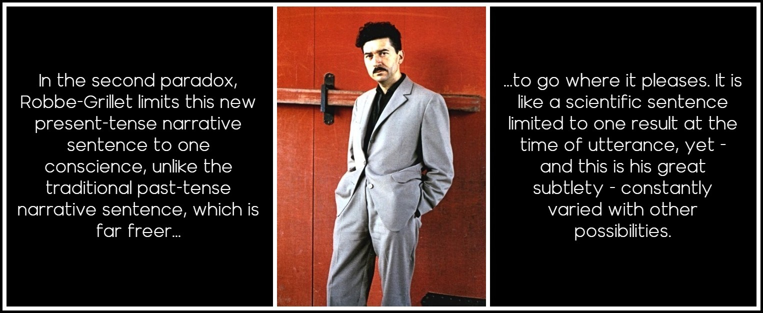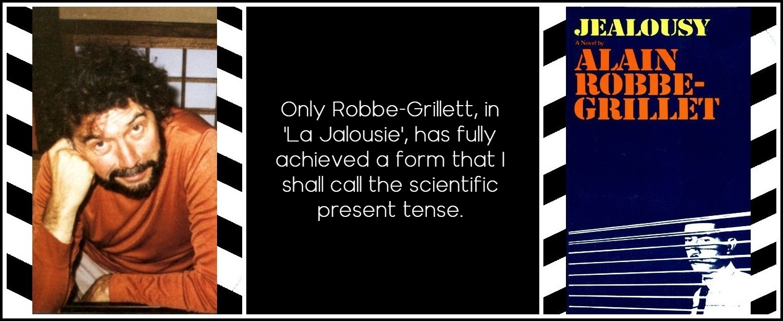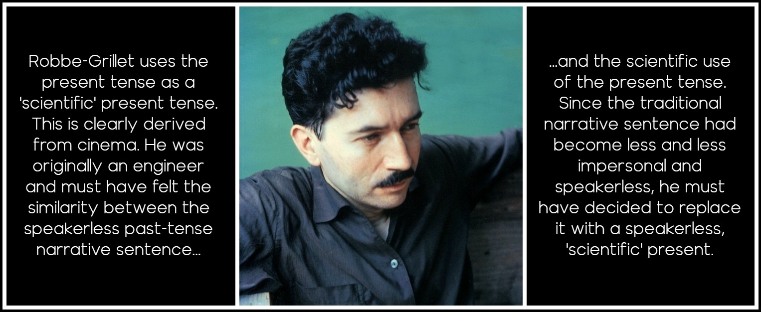 With La Jalousie he will go further than Camus or his own contemporaries in two respects. First, and paradoxically, by using the present tense of the speech system and its deictics, but with all the impersonal speakerless tone of the past-tense narrative sentence. That is, not just for momentary vividness as in the historic present; nor in direct address to the reader, like Sterne or Fielding; nor as a playful ‘look-at-me,’ like the Postmoderns; nor as inner speech or sous-conversations, like Sarraute; nor even with occasional omniscience, as here. Rather, he uses the present tense as a ‘scientific’ present tense. This is clearly derived from cinema. Robbe-Grillet was originally an engineer and must have felt the similarity between the speakerless past-tense narrative sentence and the scientific use of the present tense. Since the traditional narrative sentence had become less and less impersonal and speakerless, he must have decided to replace it with a speakerless, ‘scientific’ present. He simply puts down objectively and in detail all that hits his central consciousness (‘protagonist’).