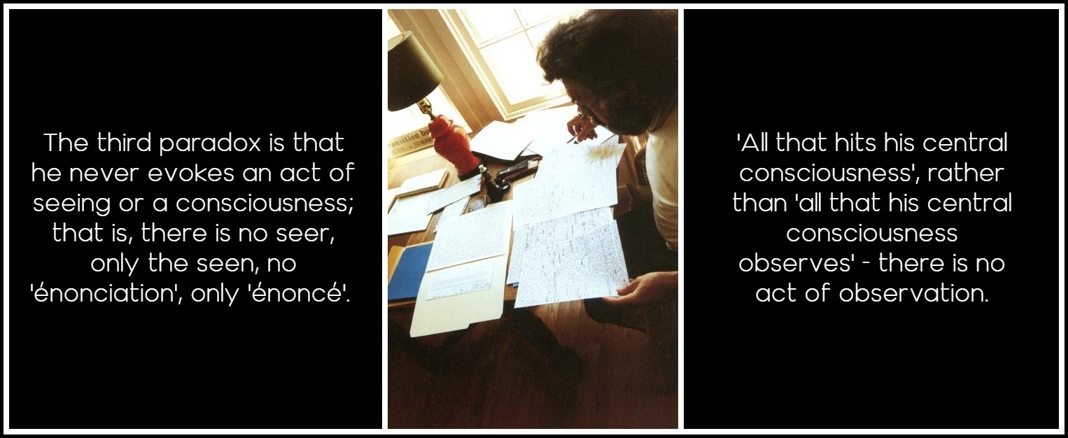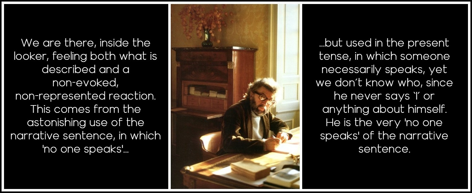 Genette mentions this double reading, which he tells us derives from the emphasis laid either on the story or on the narrative discourse: if emphasis is on the discourse, as in the interior monologue, the story seems just a pretext and can disappear; if it is on the story, it’s the narrative instance that tends to disappear. Genette gives La Jalousie as an extreme example, but does not mention either the absence of the first person, which effaces the looker, or the paradoxical ‘scientific,’ non-speech mode use of the present tense for narrative sentences. Either way we are there, inside the looker, feeling both what is described and a non-evoked, non-represented reaction. This comes from the astonishing use of the narrative sentence, in which ‘no one speaks,’ but used in the present tense, in which someone necessarily speaks, yet we don’t know who, since he never says ‘I’ or anything about himself. He is the very ‘no one speaks’ of the narrative sentence. We have to construct him, not even from what he says, as in most novels, but from what he sees.