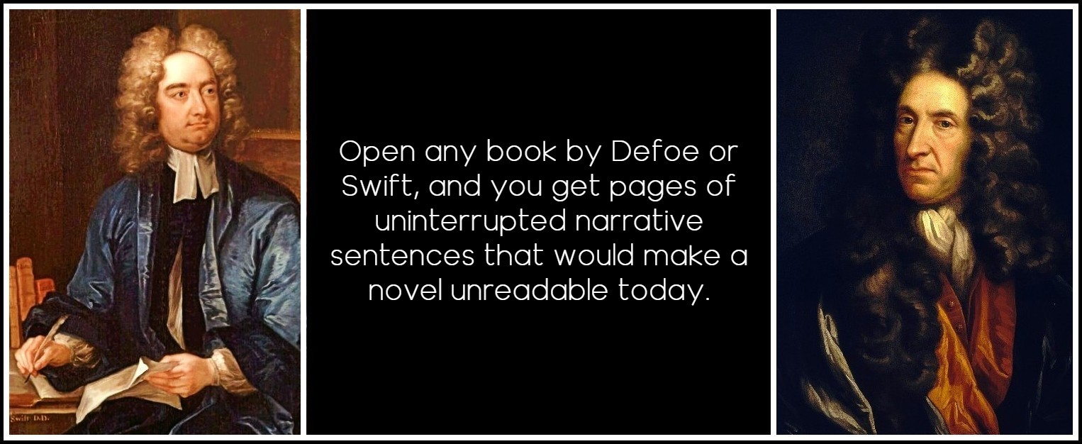The twentieth century began with a growing resentment of the author’s guiding presence in every sentence, the enveloping of every fact with comment. Authorial guidance was given in narrative sentences, as opposed to speech or thought by characters: narrative mode versus speech mode, each with a different grammar. We tend to forget that epic and romance and the early modern novel consisted overwhelmingly of narrative sentences and little dialogue, a preference for telling over showing. Open any book by Defoe or Swift, and you get pages of uninterrupted narrative sentences that would make a novel unreadable today. With Sterne and Fielding we get more speech forms, not only from characters but in playful author addresses to the reader. Then with Jane Austen dialogue elegantly enters, but it develops slowly. Her characters are fixed psychologically and socially through speech. With Henry James comes the claimed preference for showing over telling, but in fact the narrative sentence, more and more complex, still largely dominates.