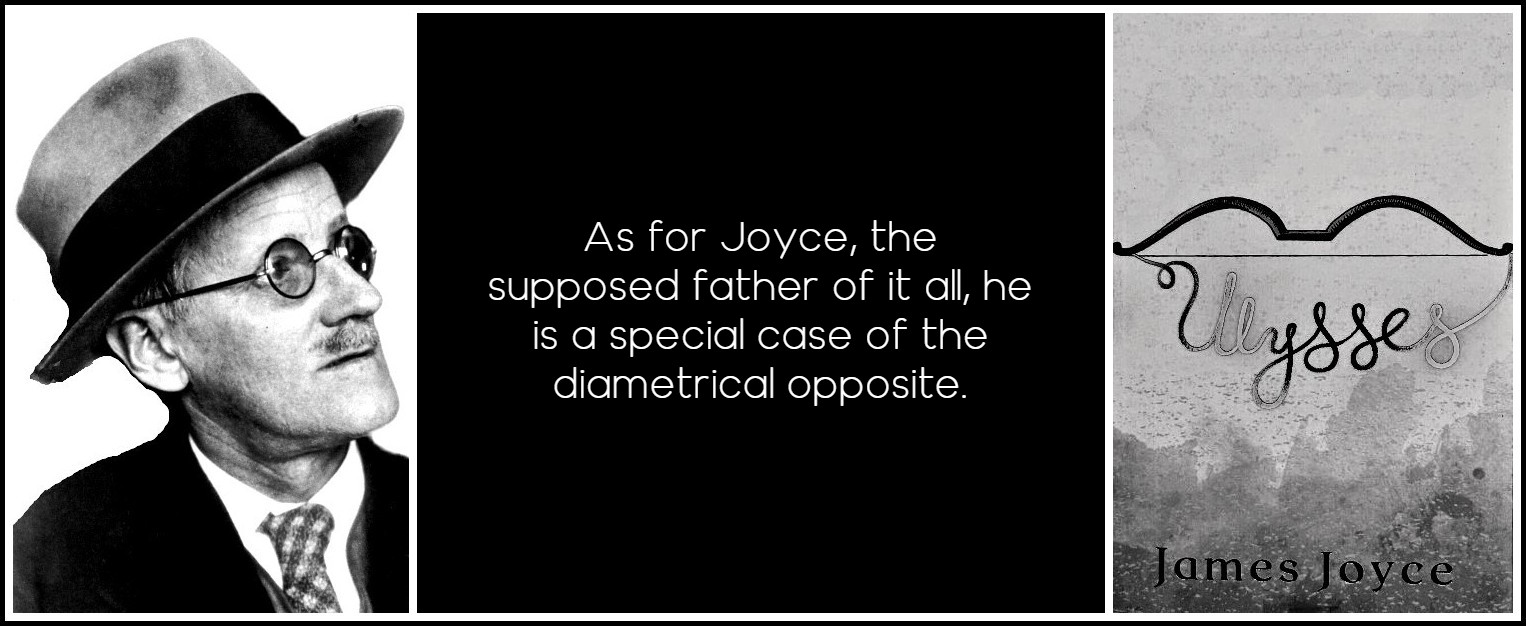 As for Joyce, the supposed father of it all, he is a special case of the diametrical opposite. In Ulysses, Joyce still uses the past narrative sentence for all activity or event whenever he’s not reproducing a character’s thoughts, which are in speech mode. But he does seem very aware of the problems posed by both narrative and speech modes, for he visibly avoids pronouns in the telegraphic speech mode of Stephen’s and Bloom’s interior monologues, so that a sudden ‘I’ is all the more visible. He turns to other genres in order to use the present ‘allowably’ as narrative; for example, the question-and-answer form of ‘Ithaca,’ which allows (inconsistently) pronounless answers, and the dramatic form of ‘Circe’ with its long or short stage directions in italics, in (inconsistently) pronounless present tenses (‘looks behind’ ) or participles (‘shuddering,’ ‘shrinking’) or adverbials (‘hurriedly,’ ‘in an oatmeal sporting suit’), through which all the character mutations are achieved.