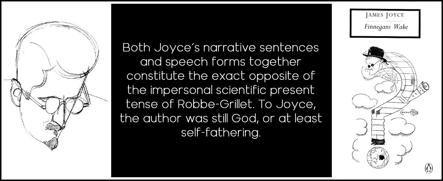 But already in ‘Sirens’ the whole classic question of who speaks is being blurred, as if Joyce were already practicing for Finnegans Wake. Here, Bloom’s thought, for instance, includes a phrase of Stephen’s from a scene Bloom did not attend. By Finnegans Wake Joyce is intent on creating an infinitely changing speaker to replace both the authoritative narrative sentence and the socio-psychologically differentiating speech forms of the classic novel. Thus endless speakers change into each other to tell of events, ‘tales within wheels,’ in both narrative forms (for events) and speech forms (for apostrophe, insult, etc.), both in a constantly reinvented idiolect, or private language. Who speaks becomes intentionally blurred by that drowning stream of ‘punsciousness’ which, however enchanting or repelling, ingenious or infantile, enriching or irritating, cannot avoid a ‘look-at-me’ tone. An epic voice, perhaps, of Shem the Penman, though constantly escaping; the too idiosyncratic voice, in fact, of the author, very visibly ‘doing his stuff.’ The narrative sentence, then, is too richly rhetorical to be in any way assimilated, either into the traditional speakerless past-tense narrative sentence it successfully destroys, or to the impersonal scientific present tense of Robbe-Grillet. Indeed, both Joyce’s narrative sentences and speech forms together constitute its exact opposite. To Joyce, the author was still God, or at least self-fathering.