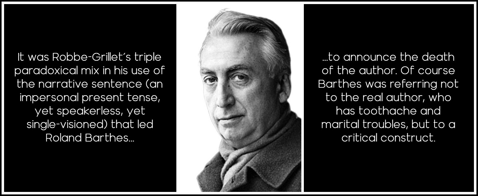 By the 1930s the author’s control was felt as omniscient and godlike. It was felt in the use of the distancing past tense and its distancing deictics, in the distancing third person even when plunged inside a consciousness (James or Woolf); it was felt even in the outside viewpoint with minimum comment and more dialogue, not only with the parentheticals that went with dialogue, but also in indirect discourse, which is a summary of what a character actually said, as well as in free indirect discourse, which I’ll come to in a moment. The last two devices (indirect discourse and free indirect discourse) vanished, more or less, in the nouveau roman, with its brand-new, startling present tense and its equally startling variations. It is not the use of the present tense as such that is original, but how it is used. Let us take four examples from the fifties (in order of ‘newness’ rather than date):