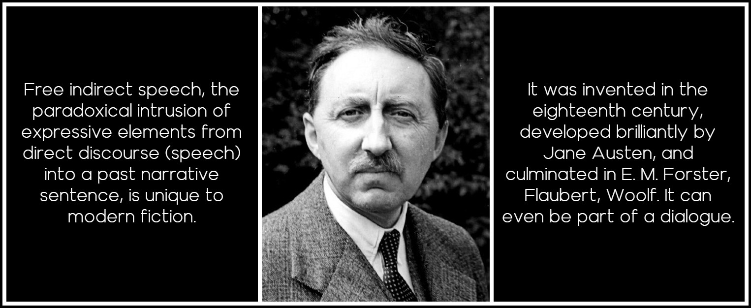 This classic question of who speaks led to a strange dispute, during the seventies and eighties, between certain linguists, notably Ann Banfield, and a few literary critics who held on to the traditional view that there are two voices in free indirect discourse and were quite unable to give up author intrusion, so merely changed the critical word ‘author’ to ‘narrator’. Free indirect speech, the paradoxical intrusion of expressive elements from direct discourse (speech) into a past narrative sentence, is unique to modern fiction. It was invented in the eighteenth century [Goethe, Wilhelm Meister’s Apprenticeship, 1795; a proto-free indirect speech], developed brilliantly by Jane Austen, and culminated in E. M. Forster, Flaubert, Woolf. It can even be part of a dialogue. Here are two typical examples from E. M. Forster’s A Room with a View: