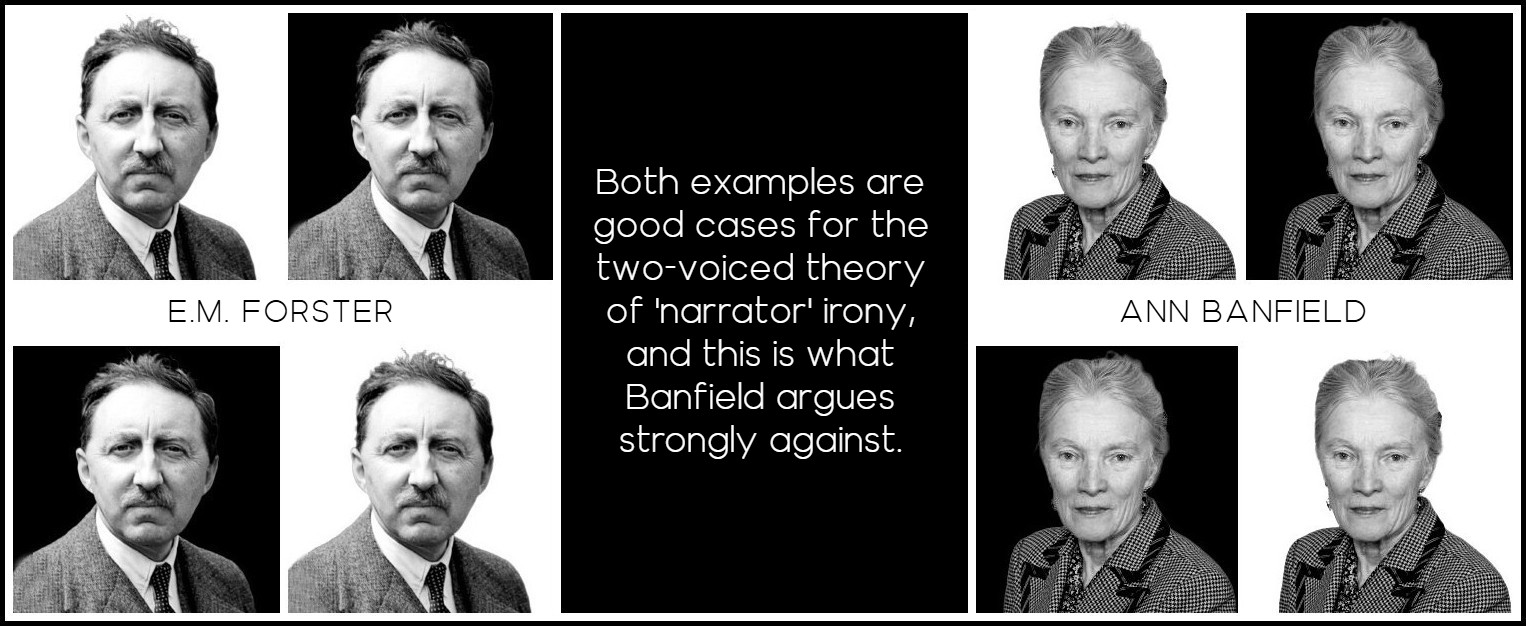 In the first quotation, Miss Bartlett and Lucy are in Florence; the conversation is rehearsed, perhaps ironically, either during or after, in Lucy’s mind (this would be Banfield’s theory) or by a narrator (as in the two-voiced theory). In the second quotation, it is not immediately obvious whose consciousness we are in, but when we read on we are more clearly in Lucy’s mind, Lucy echoing Miss Bartlett’s style in her head later, or while having the letter read to her by Mrs. Honeychurch. Both examples are good cases for the two-voiced theory of ‘narrator’ irony, and this is what Banfield’s book argues strongly against. According to her theory we are always in a character’s mind, either in reflective consciousness or in unreflective consciousness (the stating of the names illustrates unreflective consciousness).