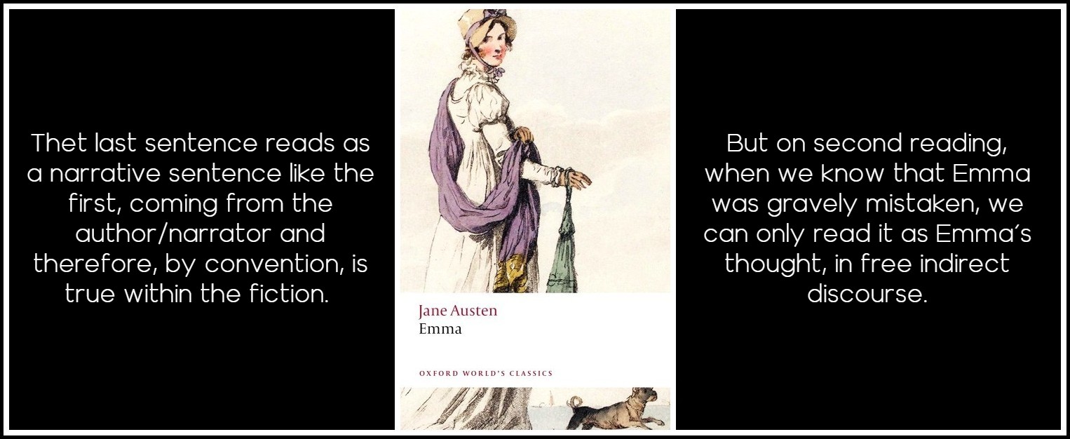 That last sentence reads as a narrative sentence like the first, coming from the author (or narrator in modern parlance) and therefore, by convention, is true within the fiction. But on second reading, when we know that Emma was gravely mistaken, we can only read it as Emma’s thought, in free indirect discourse.