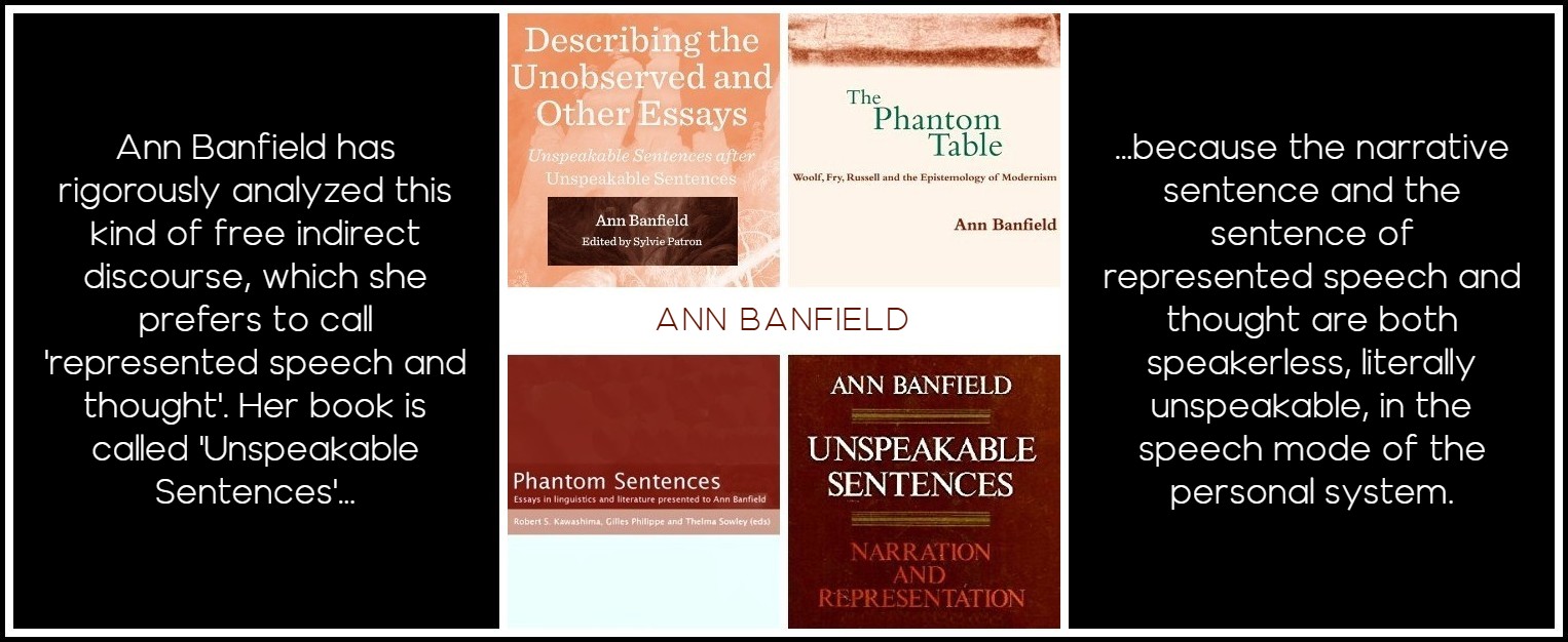 Ann Banfield has rigorously analyzed this kind of free indirect discourse, which she prefers to call ‘represented speech and thought’. I’ll do the same in this section, since the term is more accurate, not only because it can represent both speech and thought, but also because this type of sentence does not ‘imitate’ speech or thought but ‘represents’—re-presents—it. This is an important distinction. Although Banfield starts from a slightly revised version of Benveniste’s distinction between histoire and discours, her analysis is not structuralist, for she bases her argument on generative grammar. Her book is called Unspeakable Sentences (1982), because both narrative sentences (where no-one speaks) and represented-speech-and-thought sentences are specific to the narrative mode, whereas direct and indirect discourse can occur in the personal speech system. These two types of sentence, the narrative sentence and the sentence of represented speech and thought, are both speakerless, literally unspeakable, in the speech mode of the personal system.