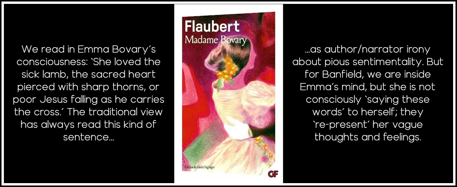 Banfield’s book is a rigorous attempt to answer the traditional view of represented speech and thought as representing two voices, that of the character and that of a so-called narrator. This view has to attribute different bits of the sentence to one or the other. She cites many literary examples given by holders of that traditional view, demolishing them one by one. For instance, we read, in Emma Bovary’s consciousness: ‘She loved the sick lamb, the sacred heart pierced with sharp thorns, or poor Jesus falling as he carries the cross.’ The traditional view has always read this kind of sentence as author/narrator irony about pious sentimentality. But for Banfield, we are inside Emma’s mind, but she is not consciously ‘saying these words’ to herself; they ‘re-present’ her vague thoughts and feelings. Banfield blames the modern silencing of the author for these various double-voiced formulations and for introducing ‘the notion of a narrator as a created persona distinct from the author alongside the notion of point of view,’ which includes evaluation. The author, she says, is ‘expunged’ but ‘reintroduced as narrator who is responsible for all the sentences in the text, as the speaker is in discourse.’ She defends an alternative theory, which sees author and narrator as distinct constructs of literary theory where ‘narrator’ is restricted to cases when the author does create a narrator, namely the first-person narrative.
