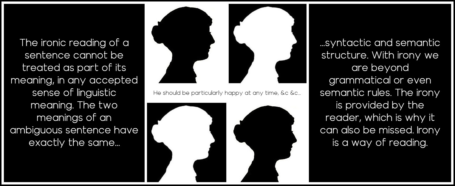 Banfield insists that even as a construct, the author is not represented in the text but can only be inferred through interpretation. Most of Banfield’s book is devoted to syntax, but she also deals with her opponents’ semantic arguments, which posit either an ‘empathy’ of the narrator or an ironic commentary. On empathy, which is linked to ambiguous represented speech and thought sentences, she invokes a consistency criterion: the facts of the fiction must be consistent with one another. For example, the sentence about Frank Churchill being in love with Emma can’t come from an undramatized narrator, nor can the character’s value judgments. As for irony, the classic case for the dual voice theory, she insists that ‘one can argue that represented speech and thought is the main vehicle for irony without thereby implying that this is an argument for the dual-voice position. For the ironic reading of a sentence cannot be treated as part of its meaning, in any accepted sense of linguistic meaning’. The two meanings of an ambiguous sentence have exactly the same syntactic and semantic structure. With irony we are beyond grammatical or even semantic rules. The irony is provided by the reader (which is why it can also be missed). Irony is a way of reading. ‘There is nothing to which the notion “narrator’s point of view” can be semantically attached that is not equivalent to the character’s point of view’.