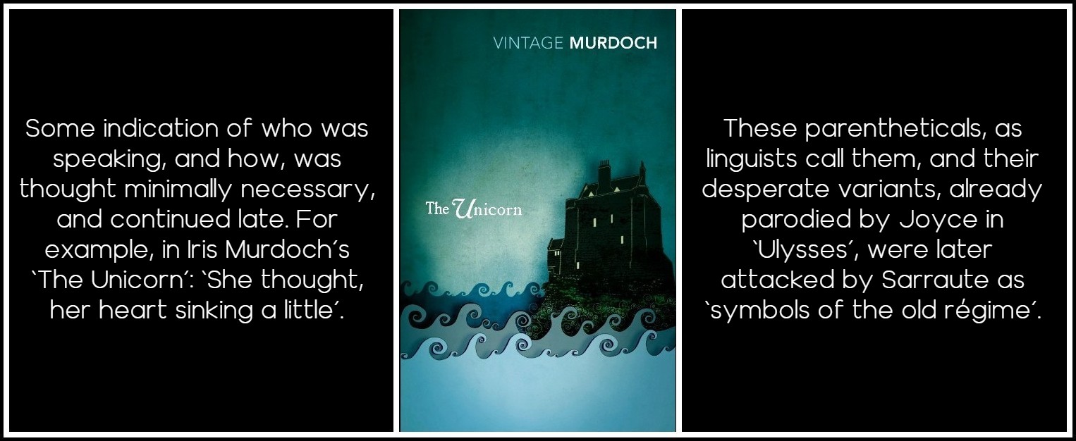 The novel has been making a huge effort to shake off the authoritarianism of the traditional narrative mode. At first, one solution was to take even the narrative sentences right inside the character as free indirect discourse; another was to get away from that and allow far more direct speech mode, either inside the character (interior monologue, as in Joyce) or as dialogue with outside viewpoint but no comment (as in the ‘anti-Modernists’ Hemingway or Waugh, as opposed to James or Woolf). An extreme version of that was the novel wholly or almost wholly in dialogue (as in examples by Henry Green or Ivy Compton-Burnett), but this, as Nathalie Sarraute later commented, was pushing the novel into the theater, where it is bound to be inferior. However, some indication of who was speaking, and how, was thought minimally necessary, and continued late. For example, in 1963 in Iris Murdoch’s The Unicorn: ‘She thought, her heart sinking a little’. These parentheticals, as linguists call them, and their desperate variants, already parodied by Joyce in Ulysses, were later attacked by Sarraute as ‘symbols of the old régime’.