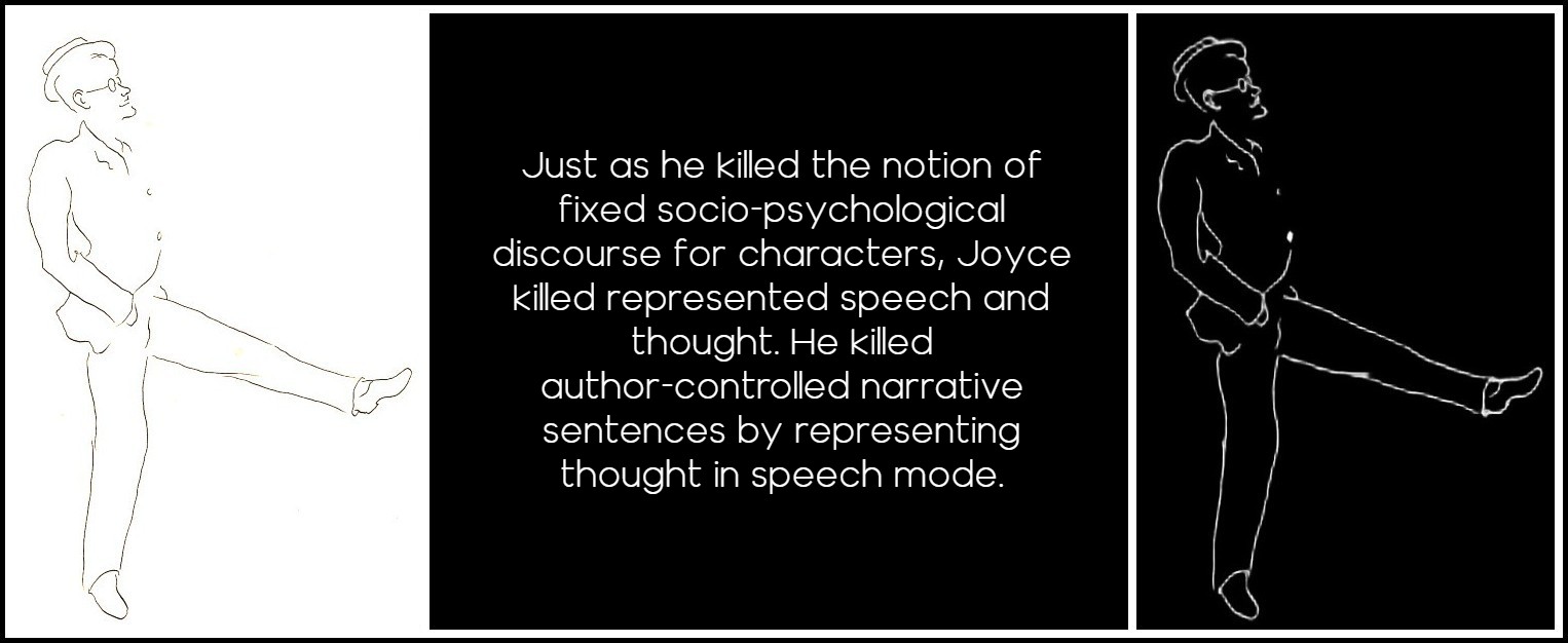 Curiously, however, Banfield makes no mention at all of Robbe-Grillet’s paradoxical attempt to use the present tense for ‘unspeakable’ narrative sentences, which are impossible in her system, nor indeed of any other writer’s much more conventional use, employing a pronoun, of present-tense narrative. Nor does she address Joyce’s represented thought in the present tense, also impossible in her system (she would call it ‘inner speech’). Her book concerns only the two traditional types of ‘unspeakable’ sentences, the narrative sentence and the sentence of represented speech and thought, both in the past tense. But she stops at Faulkner, Woolf, and Joyce. As we saw above, Forster’s use, though as witty as Austen’s, is already a little less clear as to whose mind we’re in, the character’s or the author/narrator’s. Indeed, this two-voice ambiguity is already felt in Flaubert, who was the first to develop the French imperfect to slide in and out of represented-speech-and-thought and narrative sentence: character reaction and author intrusion. By the time of Joyce this can be quite muddy. Why? Because, just as he killed the notion of fixed socio-psychological discourse for characters, Joyce killed represented speech and thought. It only occurs when he is parodying traditional styles, notably in ‘Wandering Rocks,’ ‘Scylla and Charybdis,’ ‘Cyclops,’ and ‘Nausicaa’. Joyce killed represented speech and thought (a version of author-controlled narrative sentences) by representing thought in speech mode. But not everyone read Joyce, and even the killing of represented speech and thought took a long while to trickle through.