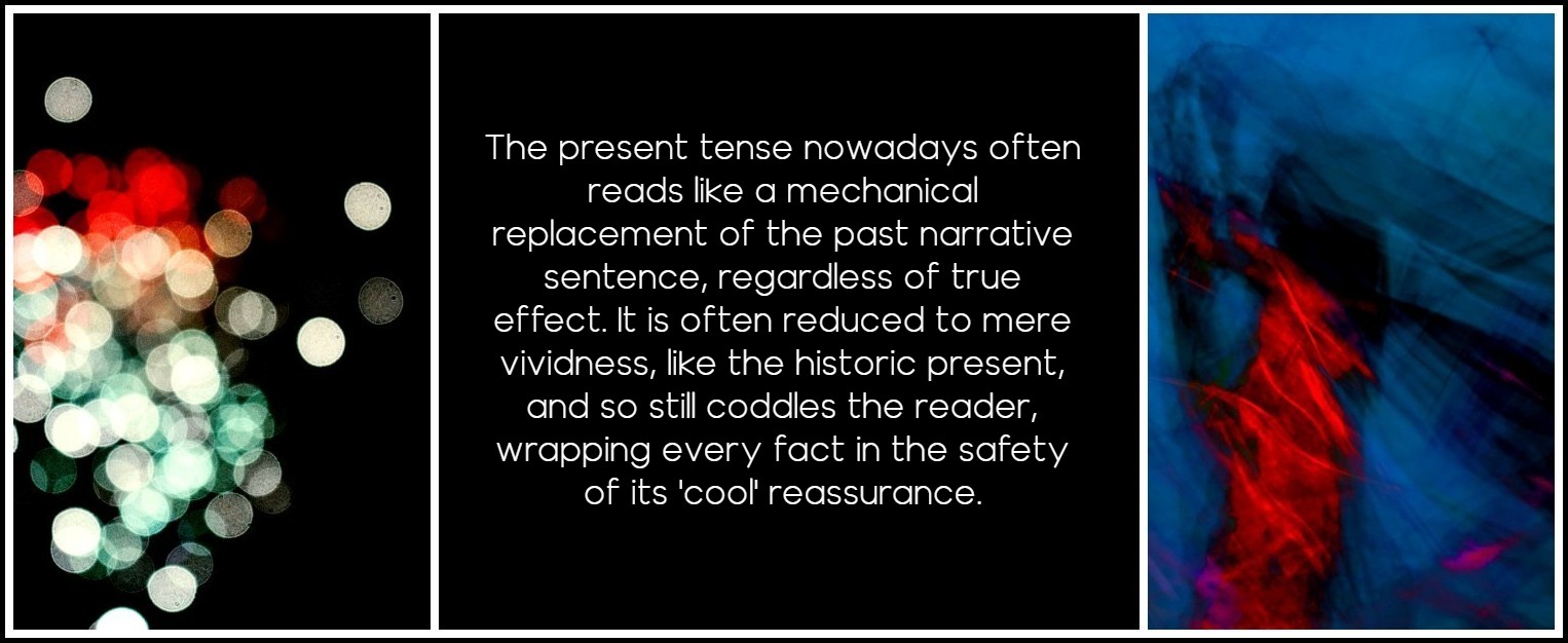 The present tense is also difficult to use for more generic reasons: the present is the predominant tense of lyric poetry. It is apt for lyrical description, less so for fictional action, which has for so long depended on the ‘guarantee’ of the past narrative sentence, so that the use of the present for action recalls those brief historic presents for vivid, non-action scenes in the classical novel. The present tense is also the tense of general statements and universal questions, the novelistic equivalent of ‘scientific statements,’ such as authors loved and still love to make in their intrusions, which can sound either dogmatic or banal. This is true at least in English, which, unlike French, also has the continuous present for simultaneous action and so tends to reserve the normal present tense for generalization. Consequently, young writers who think, a little behind the times, ‘Ah, the present, that’s the latest thing,’ and then merely replace the past in the traditional narrative sentence by the present, achieve, to my mind, little more than the critics who have merely replaced the word ‘author’ by the word ‘narrator’. Indeed, the present tense nowadays often reads like a mechanical replacement of the past narrative sentence, regardless of true effect. It is often reduced to mere vividness, like the historic present, and so still coddles the reader, wrapping every fact in the safety of its ‘cool’ reassurance.