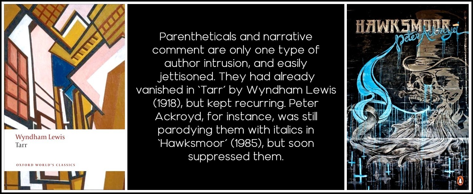 But parentheticals and narrative comment are only one type of author intrusion, and easily jettisoned. They had already vanished in Tarr by Wyndham Lewis (1918), but kept recurring. Peter Ackroyd, for instance, was still parodying them with italics in Hawksmoor (1985), but soon suppressed them. Another easily jettisoned guidance is in chapter headings, fulsome in the nineteenth century, then dropped, now more discreetly reappearing.
