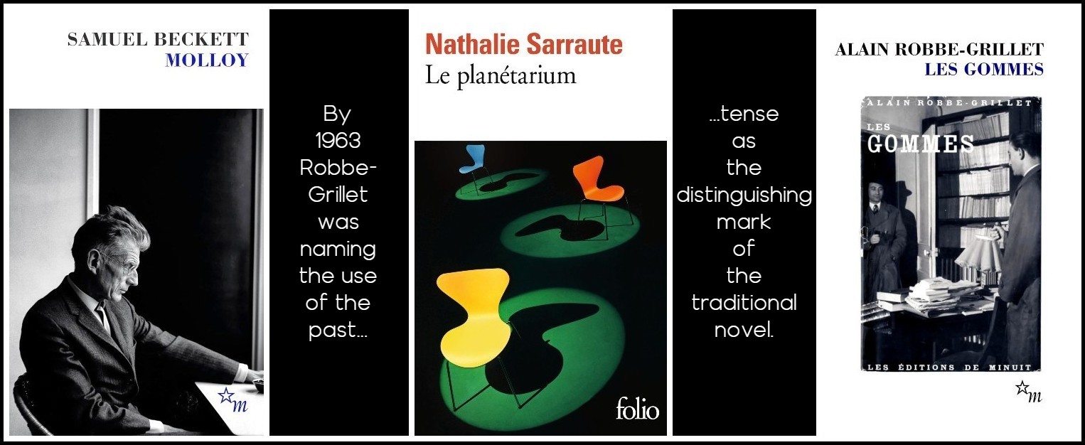 A much more pervasive feature was the past tense, which has always been used as reassuring guarantor of real events. In 1953 Alain Robbe-Grillet used the present tense throughout in Les Gommes, as did Beckett in Molloy and Sarraute in Le Planétarium. Their uses of the tense are, however, very different from each other, and had been partly foreshadowed by others. By 1963, in Pour un nouveau roman, Robbe-Grillet was naming the use of the past tense as the distinguishing mark of the traditional novel. The French narrative tense, the aorist or passé simple (passé défini) started dying in the seventeenth century and is now, being purely literary and never used in speech, fully dead, unlike the past in English or other languages, where the gap between literary and spoken language is less extreme.