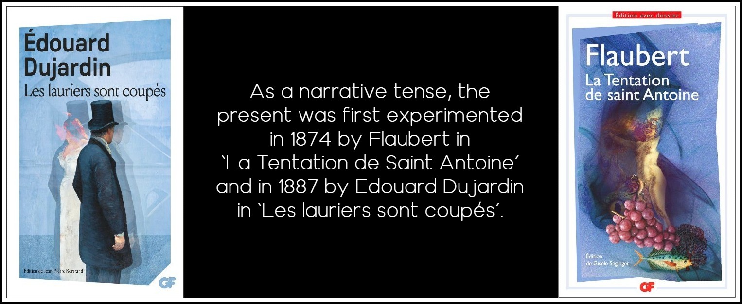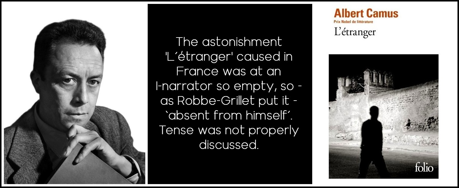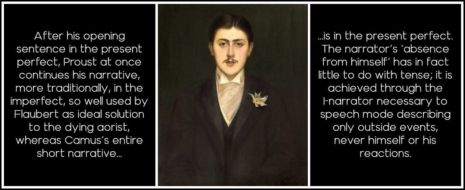 Proust’s frequent présents d’écriture (‘j’entends la rumeur des distances traversées’) were not dealt with until Genette on ‘Voice’ and ‘Narrative Instance’ in 1972, and strictly speaking are author interference in speech mode rather than narrative. His famous first sentence in the present perfect, ‘Longtemps je me suis couché de bonne heure,’ had after all appeared in 1913, even if it wasn’t really analyzed as tense until Serge Doubrovsky devoted a whole article to just that in 1971. But Proust at once continues his narrative, more traditionally, in the imperfect (continuous past, ‘mes yeux se fermaient’), so well used by Flaubert as ideal solution to the dying aorist, whereas Camus’s entire short narrative is in the present perfect. The narrator’s ‘absence from himself’ has in fact little to do with tense; it is achieved through the I-narrator necessary to speech mode describing only outside events, never himself or his reactions.