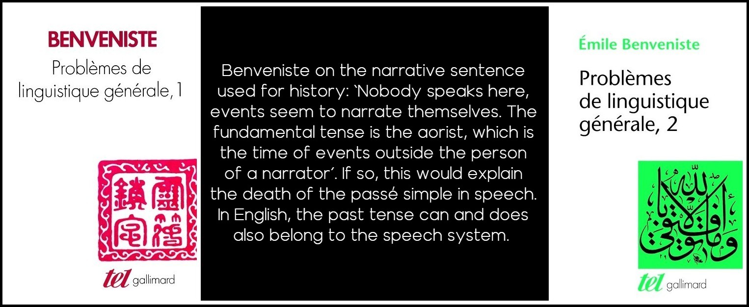 In 1966, a structuralist linguist, Emile Benveniste, clarified the distinction between histoire and discours (‘history’ and ‘speech’). So as not to create confusion with Genette’s later use of discours for ‘treatment’ and récit for ‘story,’ from the Russian Formalist fabula and syuzhet (the what and the how, the raw material of a story and the way a story is organized), I have here preferred ‘speech’ versus ‘narrative’. Benveniste’s distinction is entirely about the how, two types of telling, one for history, which uses a particular type of impersonal sentence to tell of events, and the other for the speech system (addressing the reader or, in the novel as in life, characters and people addressing each other). Here is Benveniste on the narrative sentence used for history: ‘Nobody speaks here, events seem to narrate themselves. The fundamental tense is the aorist, which is the time of events outside the person of a narrator’. If the aorist really expresses ‘the time of events outside the person of a narrator,’ this would explain the death of the once imposed passé simple in speech—and a possible difference of attitude in English and other languages, where the past tense can and does also belong to the speech system. There is no dead aorist.