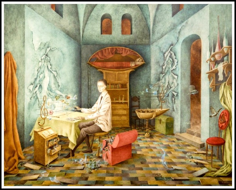 A feeling that elaborate expenditures of energy and complicated mechanical procedures may, in fact, only lead to the obvious, the unchangeable, pervades many of Varo’s works. In The Useless Science, or the Alchemist we are left guessing as to what is ‘useless,’ while in Encounter we are confronted with the uselessness of attempting change. Here a somber young woman opening a box in search of a new persona finds only her own face peering out. On the wall behind are other boxes in varying sizes, but the woman’s unfocused gaze and troubled mien suggest that they also contain the same reality. In other Varo paintings, alchemical apparatus reappears as a device to be used in the creation of both art and life. In The Creation of the Birds, the artist, personified as a wise owl, is seated at a drawing table. With one hand she holds a magnifying glass that transforms the light from a star into the form of a bird on a piece of drawing paper; with the other, she paints in its tail feathers with a brush that is connected to the strings of a violin hanging around her neck. Beside the artist an alembic receives stardust and transmutes it into colored pigment that falls onto a palette. On the wall behind the artist/alchemist two suspended vessels pass their contents back and forth, and newly created birds fly around the room. Varo’s woman/creator creates life as well as art, without the need for the inspiration of the muse or the Surrealist intervention of the loved one, for she herself possesses the secret of all creation.