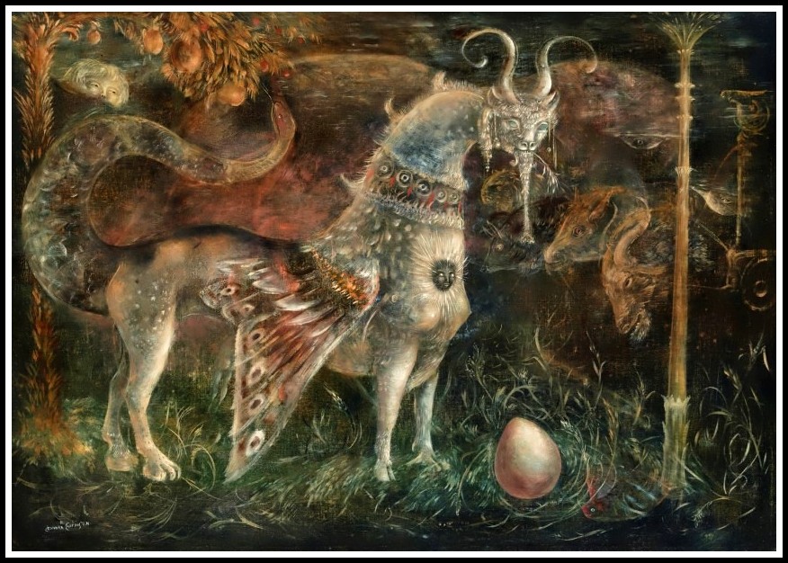 Carrington’s Who Art Thou White Face?, painted in 1959, gives an even more prominent place to the egg; a Chimaera, the fabulous winged beast on which, according to Robert Graves, Zeus flew up to heaven, binding heaven and earth, and which is always present at the poet’s creative act, stands watch over a large egg.