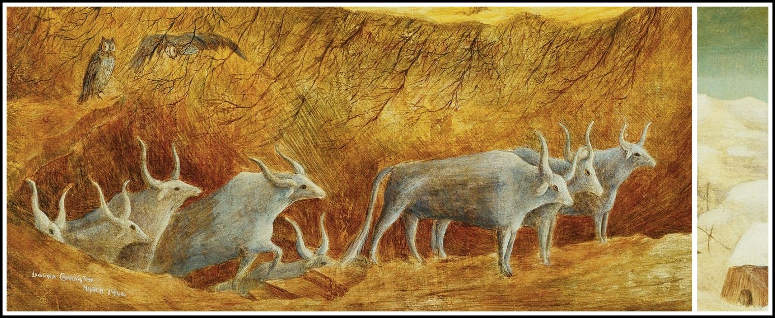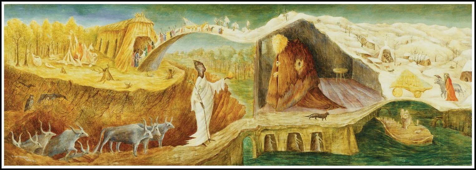 Palatine Predella, a friezelike presentation reminiscent of early Renaissance predellas with their scenes from the lives of the saints, offers simultaneous visions of several different worlds. In the middle layer of the painting, a white-robed woman ascends from a fiery underworld followed by a procession of sacred horned beasts bearing the familiar lyre-shaped horns of the goddess consort. In one hand she holds a leafy stave, in the other a flame that she offers to a bearded anchorite in a bare monastic cell. The fact that the flame does not burn her hand suggests that she has magic powers; she holds it forth as if it were a sacred flame of enlightenment, perhaps the very one that he had been seeking through prayer and fasting, but which can be revealed only by woman. Where the earth is cut away, tree roots are exposed like veins, a motif frequent in the works of Kahlo from this period. The roots trap nocturnal birds like the owl. Arching over the hermit’s cave is another landscape, this one snowy and containing another procession, beginning its ascent following a fabulous beast. Carrington’s palette fluctuates between intense reds and yellows and a deep rich green, imparting to the landscape something of a seasonal feeling. Spring-like vegetation, the deep reds and yellows of autumn, and a wintery landscape combine in a drama that reads like Proserpina’s return from the underworld, but is more likely meant to evoke the figure of the Egyptian goddess Isis.