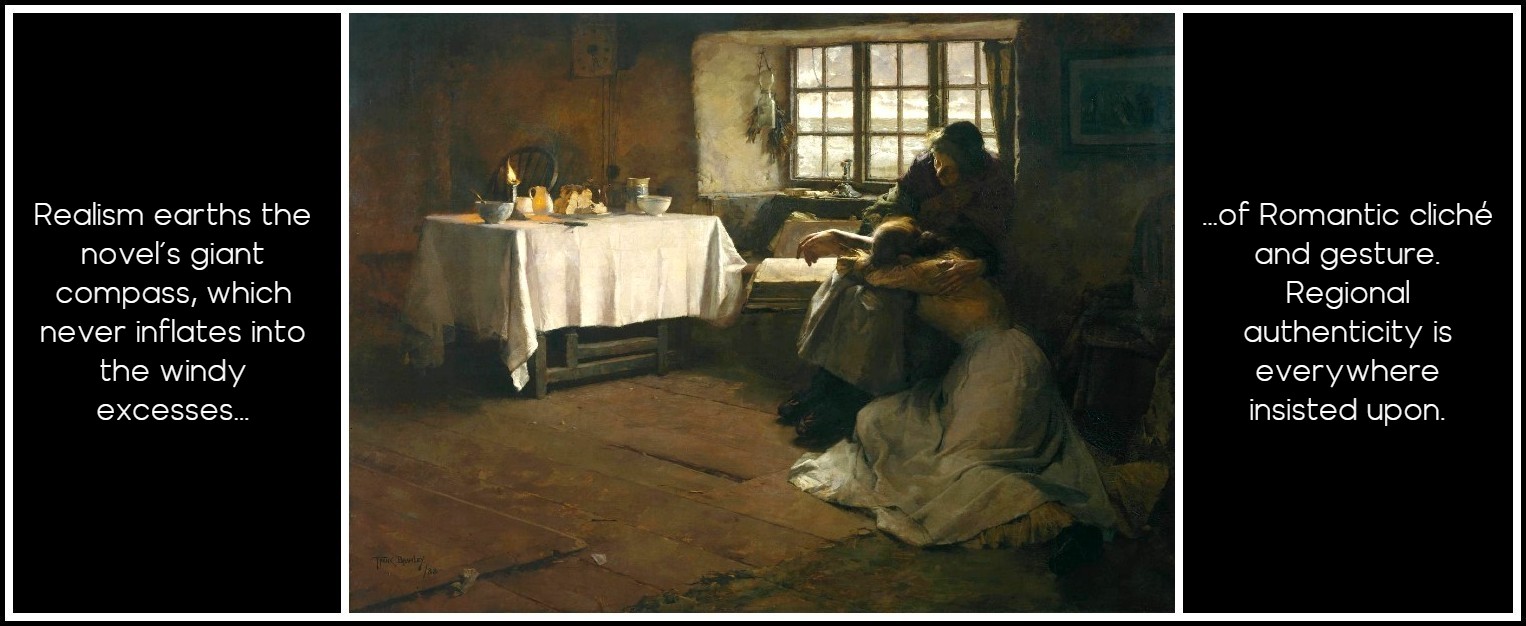 Realism earths the novel’s giant compass, which never inflates into the windy excesses of Romantic cliché and gesture. Astringent irony reinforces this meticulous down-to-earthness. Lockwood has a finicking eye for detail and Nelly lives amongst pots and pans, bedding, meal-times and childhood ailments. Wuthering Heights is no Gothic castle with ramparts and crenellations but a working farm where folk are going about their business: a wash-house, coal-shed, pump, pigeon-cote are noted. So we know that the inhabitants require the means of laundering their dirty clothes, storing fuel, drawing water. All that is lacking is a latrine. The utilitarian consciousness of the author insists on the means and functions of life in the round of farm-routine: cows are milked, sheep penned and driven, rabbits hunted for the pot. The frying pan with which the dogs are clouted is a working utensil, and the fire which roars in the grate (‘an immense fire, compounded of coal, peat, and wood’), symbolic as it may be of the blazing life-force, is created of specific local fuels, imported, dug from the moor or cut from local timber. Regional authenticity is everywhere insisted upon.