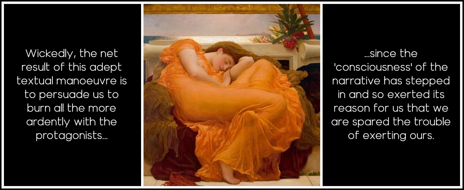 This double delivery echoes the powerful duality of the bonded but sundered hero and heroine, Cathy and Heathcliff, whose speeches ring in our memories days or years after the book has been reshelved. Female and male voices throb with the same passion of need—primary, infantile, sublime—calling out of the window of the novel into the reader’s life, to something which answers inarticulately in ourselves, behind the window of our own needy eyes: ‘Oh, he’s dead, Heathcliff! he’s dead!’; ‘Cathy, do come. Oh do–’; ‘Heathcliff, I shall die’. Yet around these voices, an ironic and distancing narrative voice sits in censorious judgement, mocking their vagaries and rebuking their nonsenses and impieties (‘Give over with that baby-work!’) while it also sympathizes with their griefs and designs stratagems of containment and control. Skeptical narrative commentary opposes the speeches and acts it endeavours to superintend; as if with the severity of the conscious mind repressing the heat of unconscious desire; or like a civilized adult holding down a child. Wickedly, the net result of this adept textual manoeuvre is to persuade us to burn all the more ardently with the protagonists, since the ‘consciousness’ of the narrative has stepped in and so exerted its reason for us that we are spared the trouble of exerting ours.