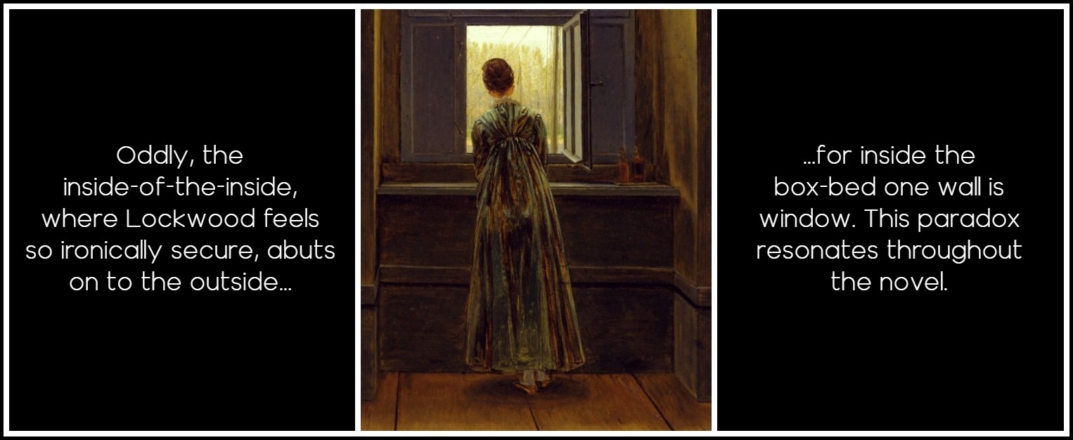Oddly, the inside-of-the-inside, where Lockwood feels so ironically secure, abuts on to the outside, for inside the box-bed one wall is window. This paradox resonates throughout the novel. The sleeping self in its supposed sanctuary, resembling the unborn in utero and the departed in panelled interment, is assaulted by spectral outsiders violently demanding entrance. The mind is not, as Milton’s Satan bragged, ‘its own place’ but an ill-defended fortification, intruded upon by the writing on the sill or in a book, its unconscious an alien world in which one does not feel oneself. The uncanniness increases as Lockwood becomes (like us and on our behalf) a reader of texts, and through his reading discovers that this narrow space he occupies was inhabited before by a treble stranger—Catherine Earnshaw… Catherine Heathcliff… Catherine Linton—whose raw and vehement testament he reproduces on the page, displacing Lockwood’s consciousness. Her text superimposes itself on his, as he has invaded her bed-space. Now indeed we, the readers, feel that we have reached the ‘inside’ of the novel: An awful Sunday!… I wish my father were back again… I took my dingy volume by the scroop, and hurled it into the dog-kennel, vowing I hated a good book… I reached this book, and a pot of ink from a shelf. So vividly authentic is the energy of the childish voice, with its burning resentment, determination and neediness (‘we cannot be damper, or colder, in the rain than we are here’) that these meagre scraps of salvage are enough to conjure up the whole complex dynamic of a family group. And this ‘innermost’ story concerns breaking out (the joint ‘rebellion), shutting in (incarceration in the back kitchen), breaking out again (‘a scamper on the moors’) and shutting out (Heathcliff’s ejection from common meals and play).