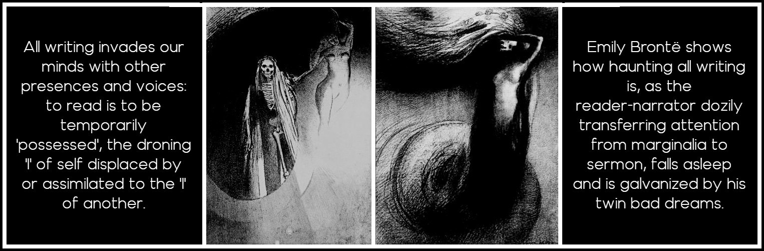 All writing invades our minds with other presences and voices: to read is to be temporarily ‘possessed’, the droning ‘I’ of self displaced by or assimilated to the ‘I’ of another. Our minds lie in another’s place, rather as the narrator spends his nights in the dead Cathy’s bed, not once but twice, for much later Nelly remarks to Lockwood that he is recuperating from his illness in the same bed at Thrushcross Grange ‘where you lie at present’ as that in which Cathy had spent her time as an invalid. Dreams like maladies may be catching. Emily Brontë shows how haunting all writing is, as the reader-narrator dozily transferring attention from marginalia to sermon, falls asleep and is galvanized by his twin bad dreams, the violent chapel-service and the dream of the child-Catherine at the window. Now Lockwood, deeply immersed in himself, dreams of entrance and exit, the dismaying interface between ‘inside’ and ‘outside’. In the first dream he is wandering outside. How can he get into his home? Joseph advises breaking in with a weapon; but, no, it is not home at all but the chapel, from which the ranting preacher excommunicates him and he suffers public rejection; in the second dream, a ghostly, homing girl knocks and begs for entrance(‘Let me in – let me in!’), which he denies. Awakening, out he comes as Heathcliff comes in. Comically, the haunted Lockwood now ‘haunts’ Heathcliff, visiting on him the garbled tokens of his dreams in the mad denunciation of his host’s maternal ancestor: ‘Was not the Reverend Jabes Branderham akin to you on the mother’s side?’. Such fatuousness has something of the sublime about it: it bursts forth on the hither side of wisdom and has its roots in the inchoate depths of the unconscious mind.