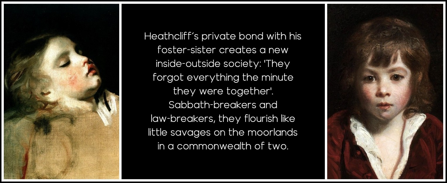 As if in ballad or folk-tale, Nelly introduces the advent of the ‘cuckoo’ Heathcliff into the Earnshaw nest: ‘One fine summer morning…’. The outsider is imported from Liverpool, ‘a dirty, ragged, black-haired child’, age unknown, name unknown, language ‘gibberish’: an ‘it’ not a ‘he’ or ‘she’, produced as if by parthenogenesis from old Mr Earnshaw’s coat. That, hateful pronoun ‘it’ dehumanizes and depersonalizes, rejects the intruder and puts him on the margin between male and female; and Heathcliff is ‘it’ fifteen times over before Nelly’s text accepts and denominates ‘him’. His ejection is the universal aim, for ‘Mrs. Earnshaw was ready to fling it out of doors’ and Nelly ‘put it on, the landing of the stairs, hoping it might be gone on the morrow’. The flare of fratricidal passion between Hindley and Heathcliff introduces the Cain theme whereby the males strive to kill or cast out. The anomalous intruder, so bonded to the father and Cathy, so branded by the antagonism of her brother, is eternally ‘outside’ even when nominally ‘inside’. But the private bond with his foster-sister creates a new ‘inside’-outside’ society: ‘they forgot everything the minute they were together’. Sabbath-breakers and law-breakers, they flourish like little savages on the moorlands in a commonwealth of two.