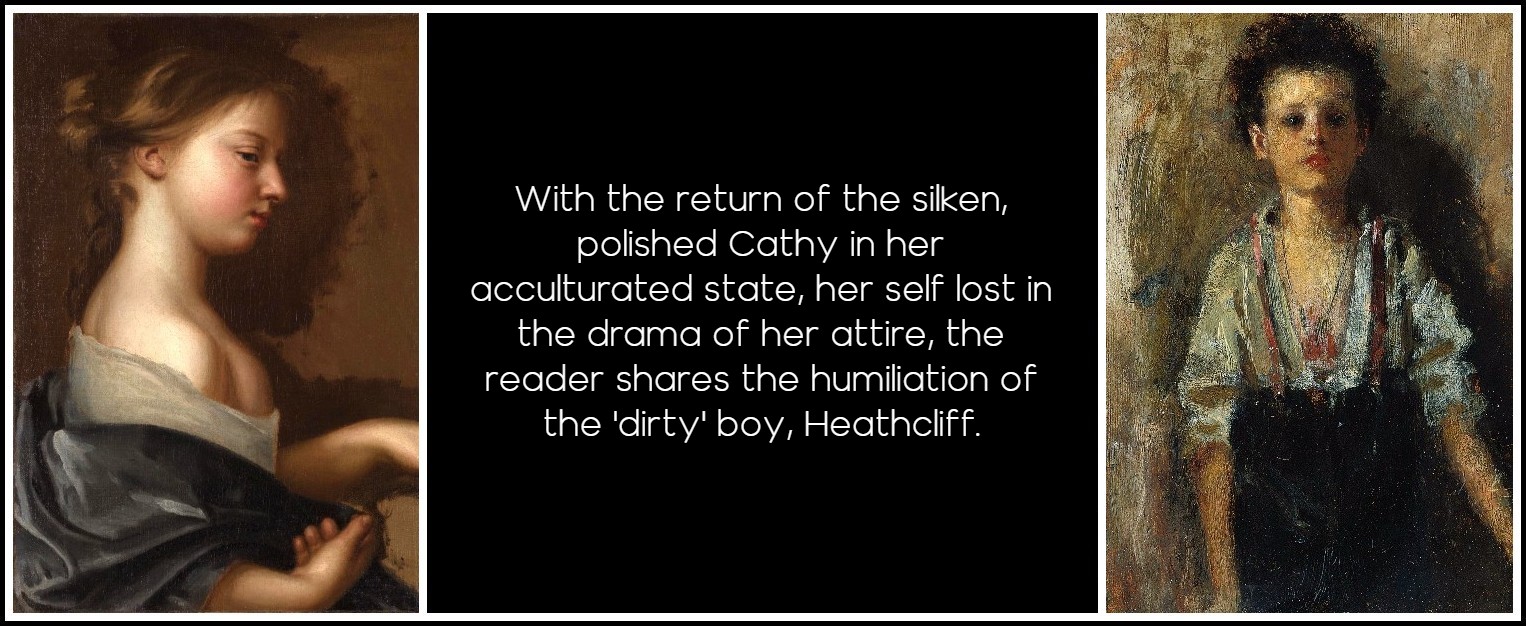 Ironically it falls to the child Heathcliff to displace Nelly as narrator by recounting the visit to Thrushcross Grange which marks a vital stage in the trauma of severance. Gaping in through the window at the (to them) palatial splendour of the interior, they are joint outsiders, comically ‘planted’ ‘on a flower-pot’, where for a poignant moment their joint beatitude, at peace with one another in shared interest, contrasts ironically with the demeaning behaviour of the squabbling Linton children framed in the window. When Cathy, bitten by the guard-dog, is taken in, Heathcliff, stigmatized as an ‘ ‘out-and-outer’ is warned off. Now he is alone on the wrong side of the window (excluded and parted) which is also the right side of the window (the moorland side). Giving the narrative to the child Heathcliff, full of defiance of the Linton pretensions and ardent in devotion to Cathy, makes his voice the inside-of-the-inside for a space, framed within Lockwood’s transmission of Nelly’s narrative. The outlaw mingles his ‘I’ with the reader’s ‘I’: We laughed outright at the petted things, we did despise them! When would you catch me wishing to have what Catherine wanted? or find us by ourselves, seeking entertainment in yelling, and sobbing, and rolling on the ground, divided by the whole room? Whatever brutality he may in future commit, we have hauntingly been within him and shared his inner world, understood the suffering of his childhood from outside (Nelly’s account) and within. With the return of the silken, polished Cathy in her acculturated state, her self lost in the drama of her attire, the reader shares the humiliation of the ‘dirty’ boy, and his mortification as, by one of a chain of plot ironies the cleaned-up Heathcliff runs smack into the derision of Hindley, precipitating the hurling of ‘a tureen of hot apple-sauce’ at the delicate Linton.