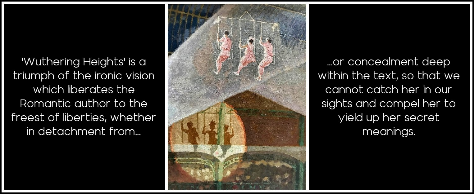 Wuthering Heights recognizes that we live in a world of eternal oppositions, whose strife is so unpalatable to society and individuals that it is blocked out by the psyche in a system of polite fictions. It therefore invites us unceremoniously into a house of multiple ironies which grasp the simplifying visitor by the throat and worry him nearly to death. The structure of dialogue in the Heights is an antiphony of assertions followed by denials, insults generating retaliations, questions balked by sneers. The characters who are all more-or-less hostile to one another as well as to the intruder, speak a common dialect of sarcasm, taunt and threat. In other words, ‘yes’ from the very first almost invariably means ‘no’ or generates ‘no’. If Lockwood is the ‘harmonious dullard’ of Wuthering Heights in whose face its witticisms explode, its dogs snarl, its fists are shaken, he also stands in for a set of attitudes which we as readers are expected to bring to the novel, and must, absolutely and peremptorily, abdicate—literality, rationality, the stable viewpoint of common sense. The antics at the Heights correspond to Schlegel’s ‘real transcendental buffoonery’, for while Lockwood’s vain imagining that Cathy might take a shine to his vapid person and the unfortunate mistake about the pet cats which turn out to be ‘a heap of dead rabbits’ take the form of broad farce, his animadversion to Heathcliff’s ‘amiable lady’ raises a spectre, from an ancient, cold aversion: ‘Where is she – my amiable lady? Mrs. Heathcliff, your wife, I mean. Well, yes. Oh! you would intimate that her spirit has taken the post of ministering angel, and guards the fortunes of Wuthering Heights, even when her body has gone. Is that it?’ Perceiving myself in a blunder, I attempted to correct it.