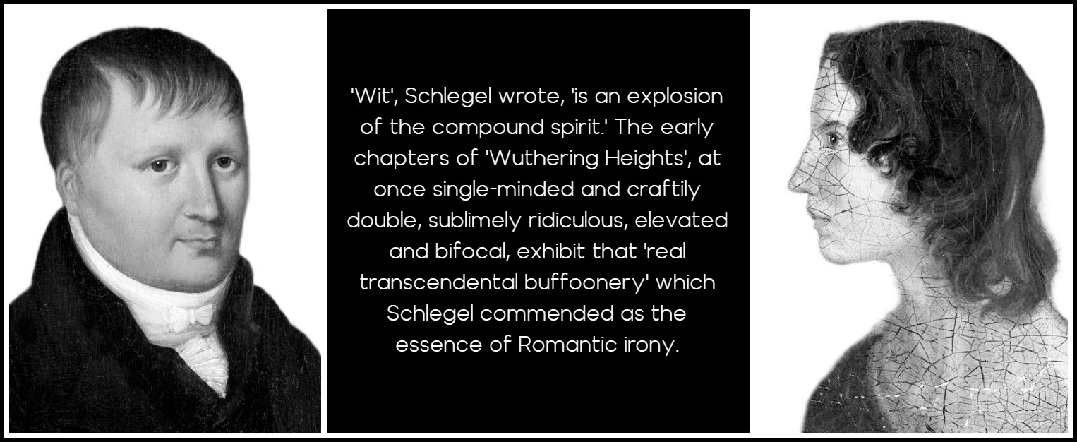‘Wit’, Schlegel wrote unforgettably, ‘is an explosion of the compound spirit.’ The early chapters of Wuthering Heights, at once single-minded and craftily double, sublimely ridiculous, elevated and bifocal, exhibit that ‘real transcendental buffoonery’ which Schlegel commended as the essence of Romantic irony, seeing novels as ‘the Socratic dialogues of our time’: In it, everything must be jest and yet seriousness, artless openness and yet deep dissimulation. It contains and incites a feeling of the insoluble conflict of the absolute and the relative, of the impossibility and necessity of total communication. It is the freest of all liberties, for it enables us to rise above our own self; and still the most legitimate, for it is absolutely necessary. It is a good sign if the harmonious dullards fail to understand this constant self-parody, if over and over again they believe and disbelieve until they become giddy and consider jest to be seriousness and seriousness to be jest. Wuthering Heights is indeed an exploding novel. It is a triumph of the ironic vision which liberates the Romantic author to ‘the freest of liberties’, whether in detachment from or concealment deep within the text, so that we cannot catch her in our sights and compel her to yield up her secret meanings. And the explosion is generated from what Schlegel calls a ‘compound’ mind. Uniquely, Emily Brontë’s irony represents the complexity of a mind aware of and not intimidated by its own inner conflicts and those of the world outside. Irony, which says one thing and means another, is a close cousin of paradox, which asserts apparently incompatible truths.