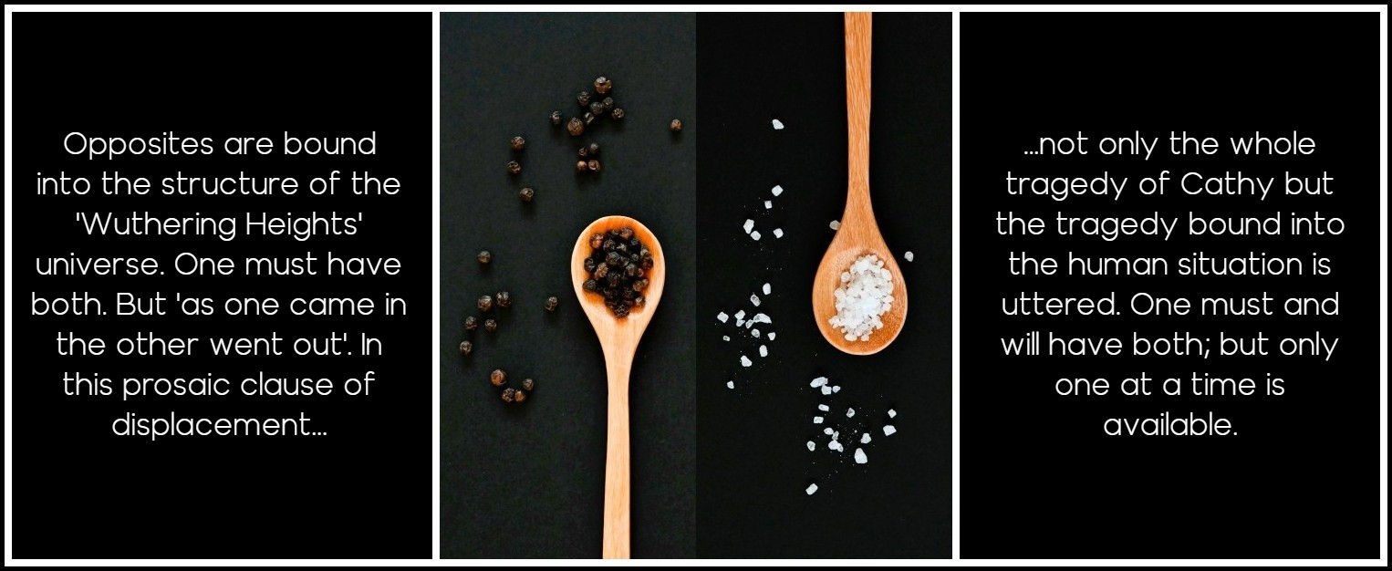 A dualism derived from German Romantic philosophy builds the tension between Linton and Heathcliff into a powerful image for the whole doubly bound Creation. Schelling had shown that contradiction was essential to life, for ‘Without contradiction there would be no motion, no life, no progress, but eternal immobility, a deathly slumber of all powers’, but those opposites which in God harmoniously coincide in eternal totality, on earth are mirrored in the ceaseless conflict of incompatibles. That is our tragedy. Emerson phrased this perception memorably when he wrote that: An inevitable dualism bisects nature, so that each thing is a half, and suggests another thing to make it whole; as, spirit, matter; man, woman; odd, even; subjective, objective; in, out; upper, under; motion, rest; yea, nay. Because each thing implies the other, the boundaries of twin opposites are put in doubt: the affirmed ‘yea’ implies the denied ‘nay’, the hill the valley, male female, Heathcliff Linton. These opposites are bound into the structure of the Wuthering Heights universe. One must have both. But ‘as one came in the other went out’. In this prosaic clause of displacement, not only the whole tragedy of Cathy but the tragedy bound into the human situation is uttered. One must and will have both; but only one at a time is available.