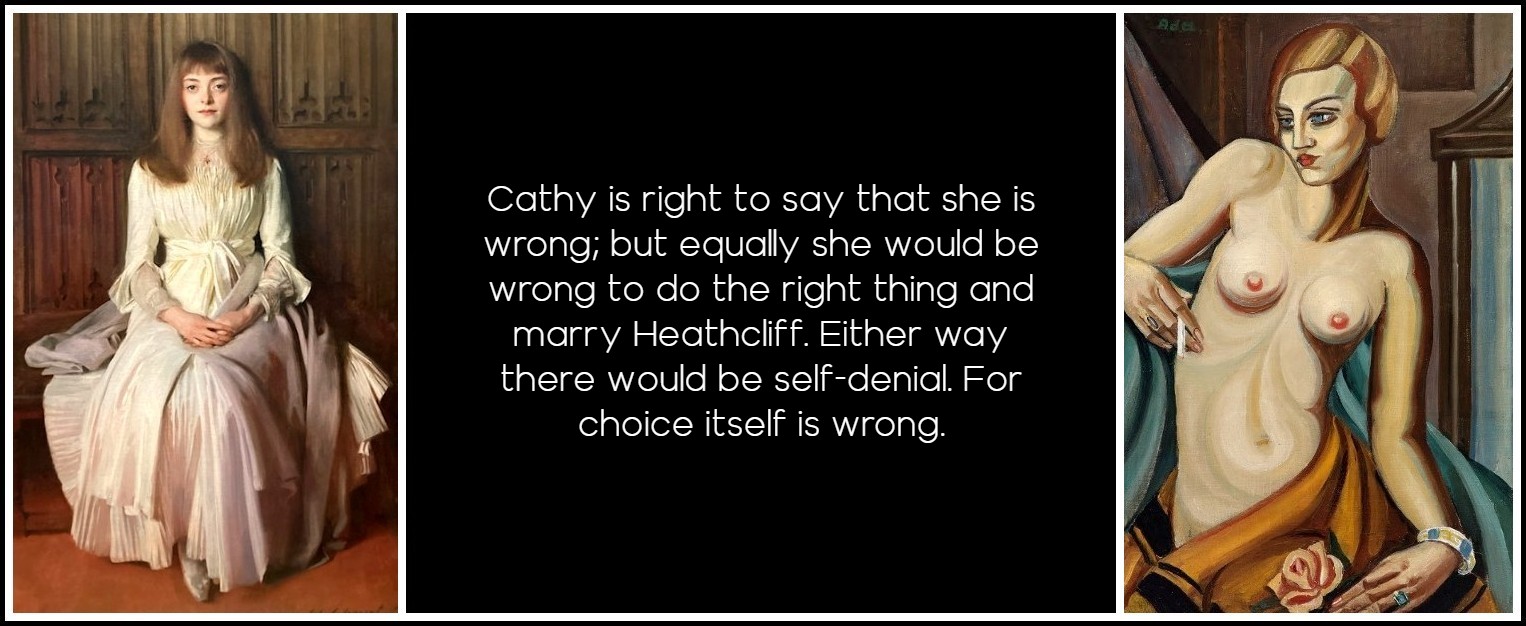 Schelling solved this problem for God by stating that He experiences double time simultaneously, so that His No and Yes can be said together, in meaningful synthesis. For man it is sadly otherwise. The necessity for choice between alternatives is a social requirement. And because, as Schelling and Schlegel both believed, each individual is also binary, the mind composed of twin hemispheres, its will and desires double, Catherine must go on, inexorably in the succeeding chapter, to cleave herself in two to the root, in choosing Linton over Heathcliff, all the while nagging at Nelly to ‘be quick, and say whether I was wrong!’; ‘I’m convinced I’m wrong!’. Cathy is right to say that she is wrong; but equally she would be wrong to do the right thing and marry Heathcliff. Either way there would be self-denial. For choice itself is wrong. But we are so unequivocally bound into the world of equivocal oppositions that choice is imperative. The self is fatally sundered from itself (or its opposite, which implies the self).