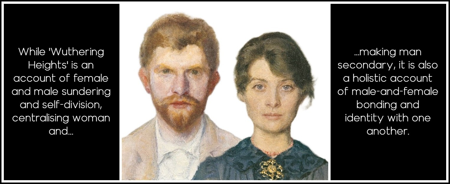 In denying the fundamental opposition of male and female, it is capable of speaking on behalf of humanity as a whole. Virginia Woolf expressed this powerfully when she wrote: That gigantic ambition is to be felt throughout the novel—a struggle, half thwarted but of superb conviction, to say something through the mouths of her characters which is not merely ‘I love’ or ‘I hate’, but ‘we, the whole human race’ and ‘you, the eternal powers…’. The sentence remains unfinished. The novel seems to speak at the genderless level of ‘soul,’ and it speaks for both sexes in the same scintillating but strangely neutral voice of the spirit at fullest stretch: ‘I am Heathcliff’ annihilates the significance of biological and cultural gender distinctions. Yet at the same time, Wuthering Heights is the testament of a woman and recreates the human race in her own image. ‘Man’ in our language covers for ‘man’ and ‘woman’ in a species denominated homo sapiens. Wuthering Heights reverses this bias: ‘woman’ covers for ‘man’, for both emerge dyed in the colours of the author’s female experience, desires and perceptions. Little good it does to either, for each inhabits a world of tragic impairment and forsakenness; once, they were one, but not now, or yet.
