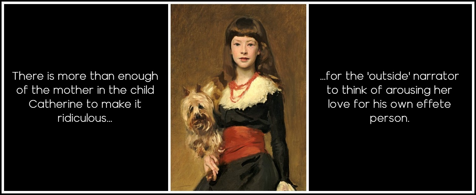 Beginning in crescendo, the second volume dies in diminuendo. The awesome beauty and ferocity of Cathy’s and Heathcliff’s final meeting open the volume. From this clashing climax, the child is born, to find the way back home to the Earnshaw roots in a circuitous process which has something of the sense of benign destiny of Shakespeare’s tragi-comedies, especially The Winter’s Tale. The relaxation of the telling in the second part, with its discursive manner, accompanies a slackening of the dynamic tension between the tellers and the tale. Nelly’s aversion to the first Catherine gives way to scolding indulgence of the second. Lockwood, who arrived in farce, departs from the house in pique. There is more than enough of the mother in the child Catherine to make it ridiculous for the ‘outside’ narrator to think of arousing her love for his own effete person.