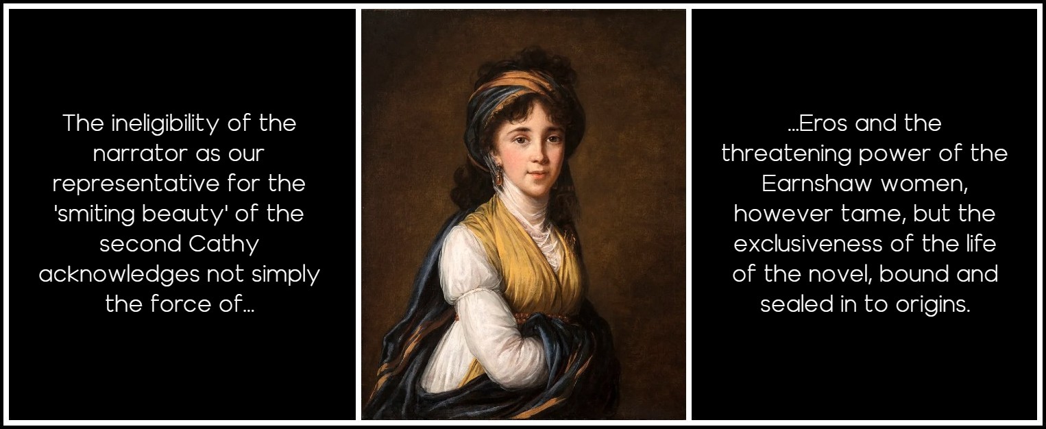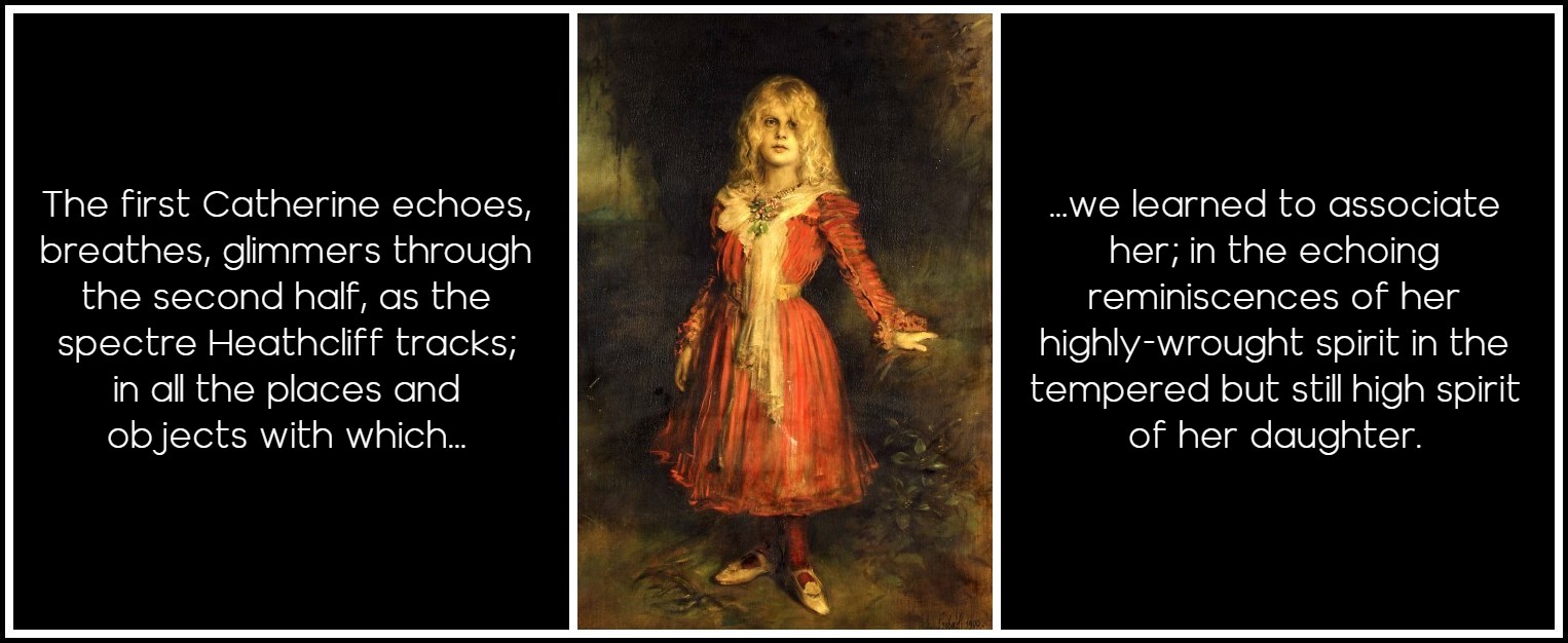 In the final sentence of Volume I, Lockwood vows to resist the charms of the second Cathy, lest ‘the daughter turned out a second edition of the mother!’. Thus the bleating baa-lamb who fondly imagines mating with the daughter of a tempest ironically inaugurates a second volume in which a second generation will re-present the problems of the first and reverse their issue, through the person of a second Cathy who is not quite a ‘second edition’ but rather a revised edition of the first. Whereas the first volume, dominated by the first Cathy, moved inexorably towards tragedy and destruction, the second, involving her daughter, progresses through elimination of the hybrid Linton Heathcliff toward the establishment of the appearance of harmony and balance. However, in the cyclical world of Wuthering Heights, the ‘first edition’ is not cancelled out by the second. The first Catherine echoes, breathes, glimmers through the second half, as the spectre Heathcliff tracks; in all the places and objects with which we learned to associate her; in the echoing reminiscences of her highly-wrought spirit in the tempered but still high spirit of her daughter; even in the mirroring eyes of her nephew, Hareton. She seems not so much ‘in’ the text as ‘behind’ it; the words on the page echo but can never disclose her. Her absence signifies her, and Heathcliff’s loss exclaims against her amputation from his own person, with all the power of the newly-bereaved.