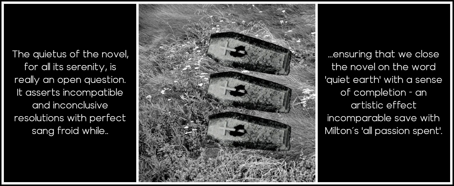 Both Linton and Heathcliff are described as dying in beatitude because they are going home; going to Catherine, that is. Linton’s eyes ‘seemed dilating with ecstasy. He died blissfully, Mr Lockwood; he died so’. He and Heathcliff both will themselves into the underground bed of Catherine, with equal intensity. Edgar Linton, portrayed with sympathy and respect for his gentle and amiable characteristics (though not, perhaps, with much enthusiasm) loves without rapacity but with equal constancy. Does he find the first Catherine at the end of his vigil? Does Heathcliff, found dead with that ‘frightful, life-like gaze of exultation’ on his face, find her? With the appearance of ecstasy on the one hand and triumph on the other, the god-fearing man and the devil-daring man give tokens that they have gone to meet not their Maker, but their idol and counterpart: the same self, Catherine. The quietus of the novel, for all its serenity, is really an open question. It asserts incompatible and inconclusive resolutions with perfect sang froid while ensuring that we close the novel on the word ‘quiet earth’ with a sense of completion—an artistic effect incomparable save with Milton’s renowned ‘quiet endings’: ‘calm of mind, all passion spent’. To Lockwood’s jocularity about Wuthering Heights being evacuated ‘for the use of such ghosts as choose to inhabit it’, Nelly cuts in with a jittery ‘No, Mr Lockwood . I believe the dead are at peace, but it is not right to speak of them with levity’. For, of course, you never know. That down-to-earth axiom is the uncanny burden of the novel.