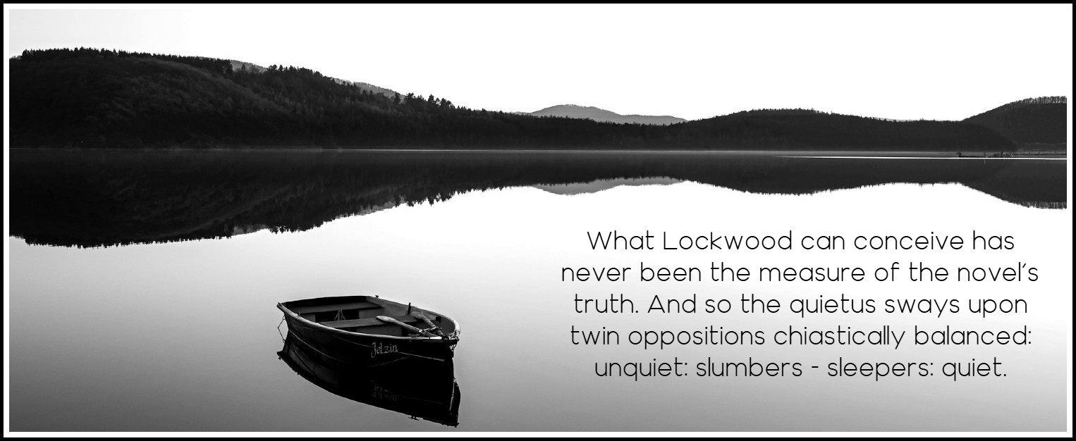 An echo of ‘Heathcliff’ breathes in ‘heath’, of ‘Hareton’, ‘Isabella’ and ‘Ellen’ in ‘hare-bells’. The poetry of the final sentence communicates the balance of a kind of prose quatrain, founded on alternating alliterations in the verbs which recall the composure of Lockwood’s physical and mental activities at this site of beauty and stillness: ‘I lingered, watched, listened, wondered’. To ‘linger’ is to delay the speedy exit he had proposed; to ‘watch’ and ‘listen’ are to be open to sights and sounds in a receptiveness which culminates not in a decision or conclusion but in ‘wonder[ing]’. There is no finality, only the suspense of meditation, itself dualistic for, while the thinker conceives only of a conclusive quietude, he must take account of the opposite theory, held by others, ‘any one’. What Lockwood can conceive has never been the measure of the novel’s truth. And so the quietus sways upon twin oppositions chiastically balanced: unquiet: slumbers – sleepers: quiet.