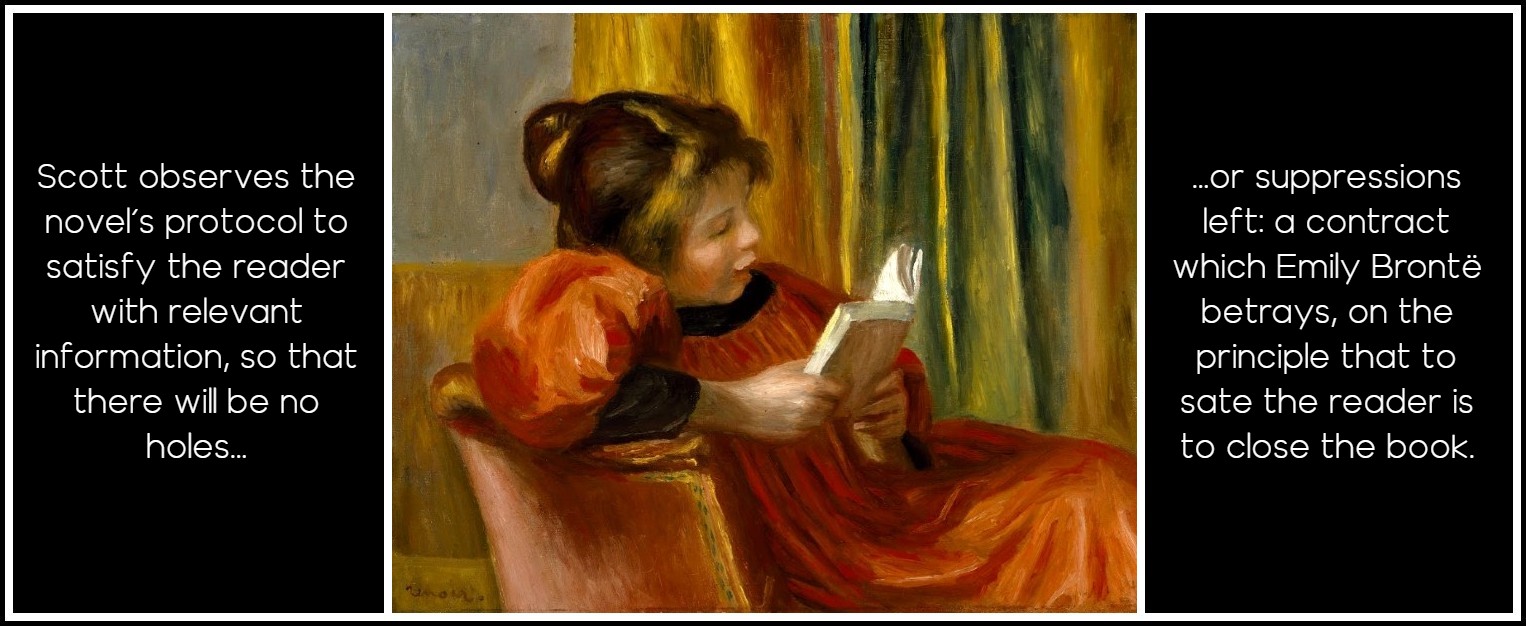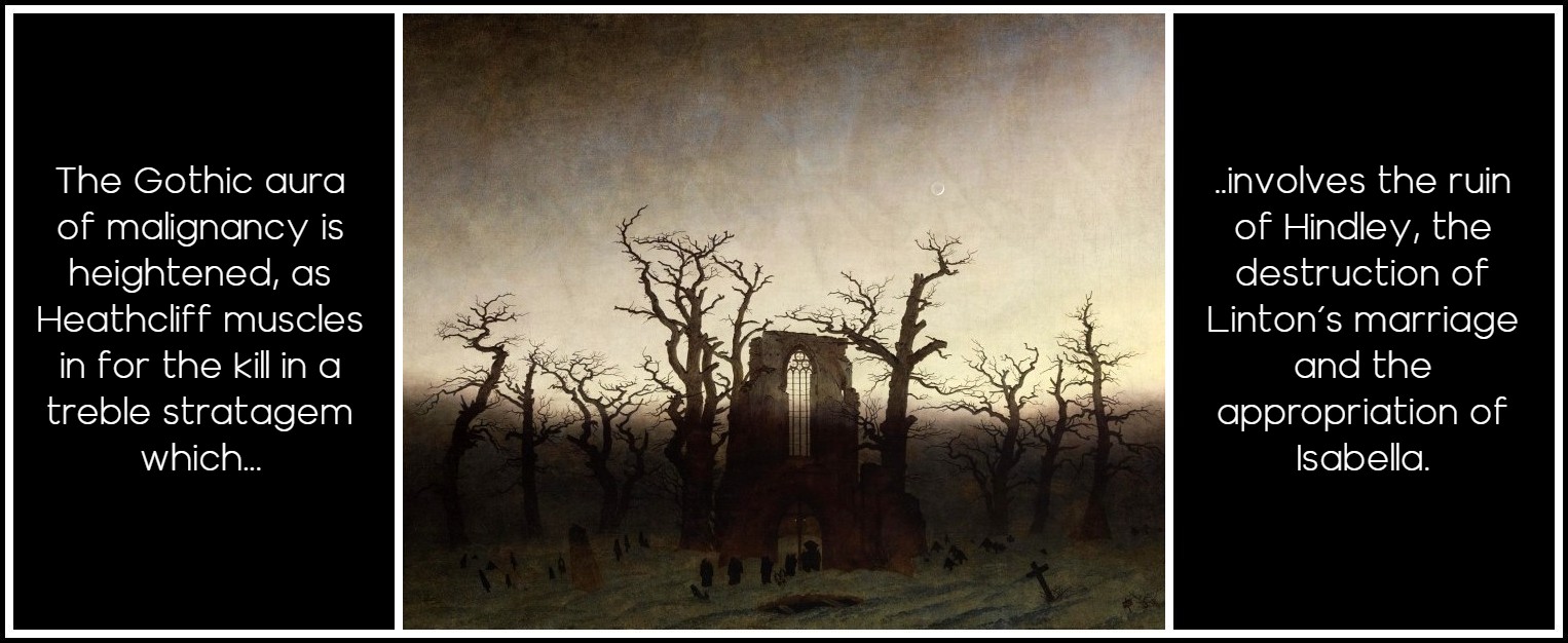 Storm succeeds; lashing rain; a split bough; Joseph raving in prayer; the discovery of the vanishment of Heathcliff; Cathy’s suicidal delirium. Chapter IX closes with the ‘awakening’ of narrator and listener to self-consciousness; Nelly’s departure for bed and Lockwood’s groggy determination to sleep too. But in the minor key, the deathwards drift is hauntingly echoed in the rumour of a final quietus. Nelly has not ‘gone to bed’: she ‘is vanished to her rest’, and Lockwood will shortly follow. The author teases our eagerness for the story to go on being told by keeping Lockwood ill in bed for a month: when he revives, all Nelly seems disposed to talk about is his medicine. Lockwood testily demands to know where Heathcliff went after he fled. All Nelly will say is that she ‘couldn’t give my word for any’. Heathcliff came originally from the unknown, via Liverpool, and when he runs away it is to a textual nowhere. The young Emily’s hero, Sir Walter Scott, managed things differently: he observes the novel’s protocol to satisfy the reader with relevant information, so that there will be no holes or suppressions left: a contract which Emily Brontë betrays, on the principle that to sate the reader is to close the book. Apparently Heathcliff has given his enemy Hindley some account of his travels and rehabilitation, enough to prompt an invitation to ‘walk in’ but we are—almost contemptuously—excluded from the information. This narrative avarice gives the reject a second birth into the book, a revenant recovering from a form of linguistic death: the Gothic aura of malignancy is heightened, as he muscles in for the kill in a treble stratagem which involves the ruin of Hindley, the destruction of Linton’s marriage and the appropriation of Isabella.
